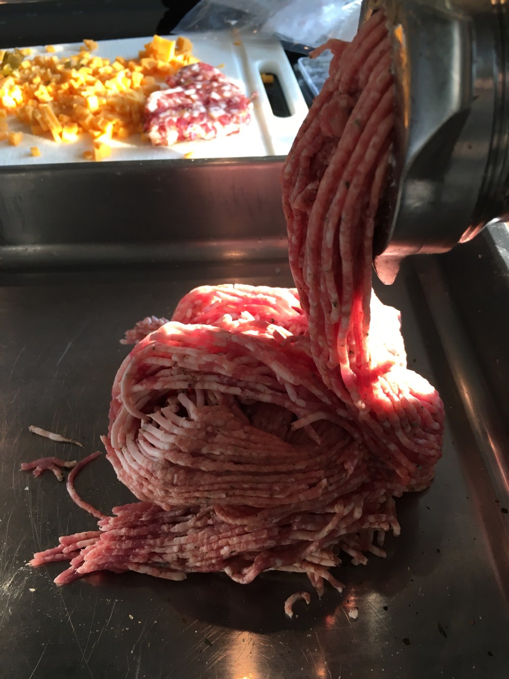 Das angefrorene und wolfgerecht gewürfelte Fleisch mit der Gewürzmischung mischen und anschließend mit der 3 mm Scheibe durch den Fleischwolf lassen. Anschließend alles gut durchmischen und bearbeiten, bis eine gute Bindung und klebrige Masse entsteht