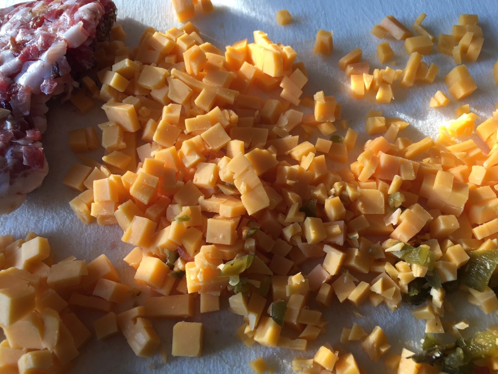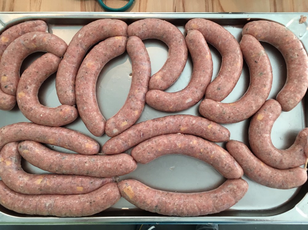 Anschließend die gehackten Jalapeños, den gewürfelte Cheddar und die Baconwürfel ins Brät einarbeiten und das ganze in Schweinedärme mit dem Kaliber 26/28 füllen. Abschließend habe ich die Würste noch auf eine Länge von 20cm abgedreht.
