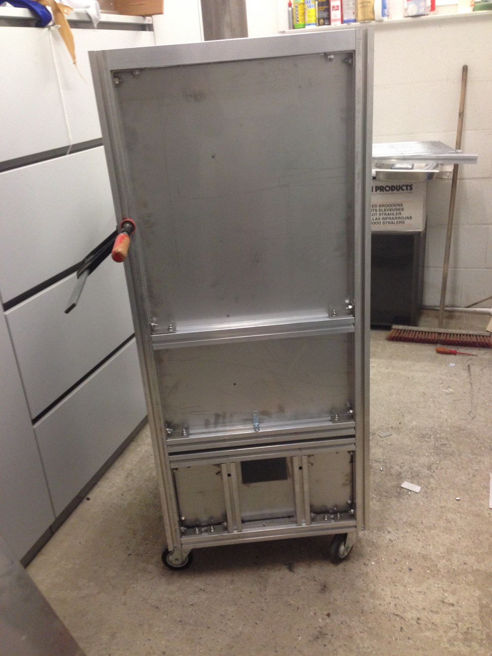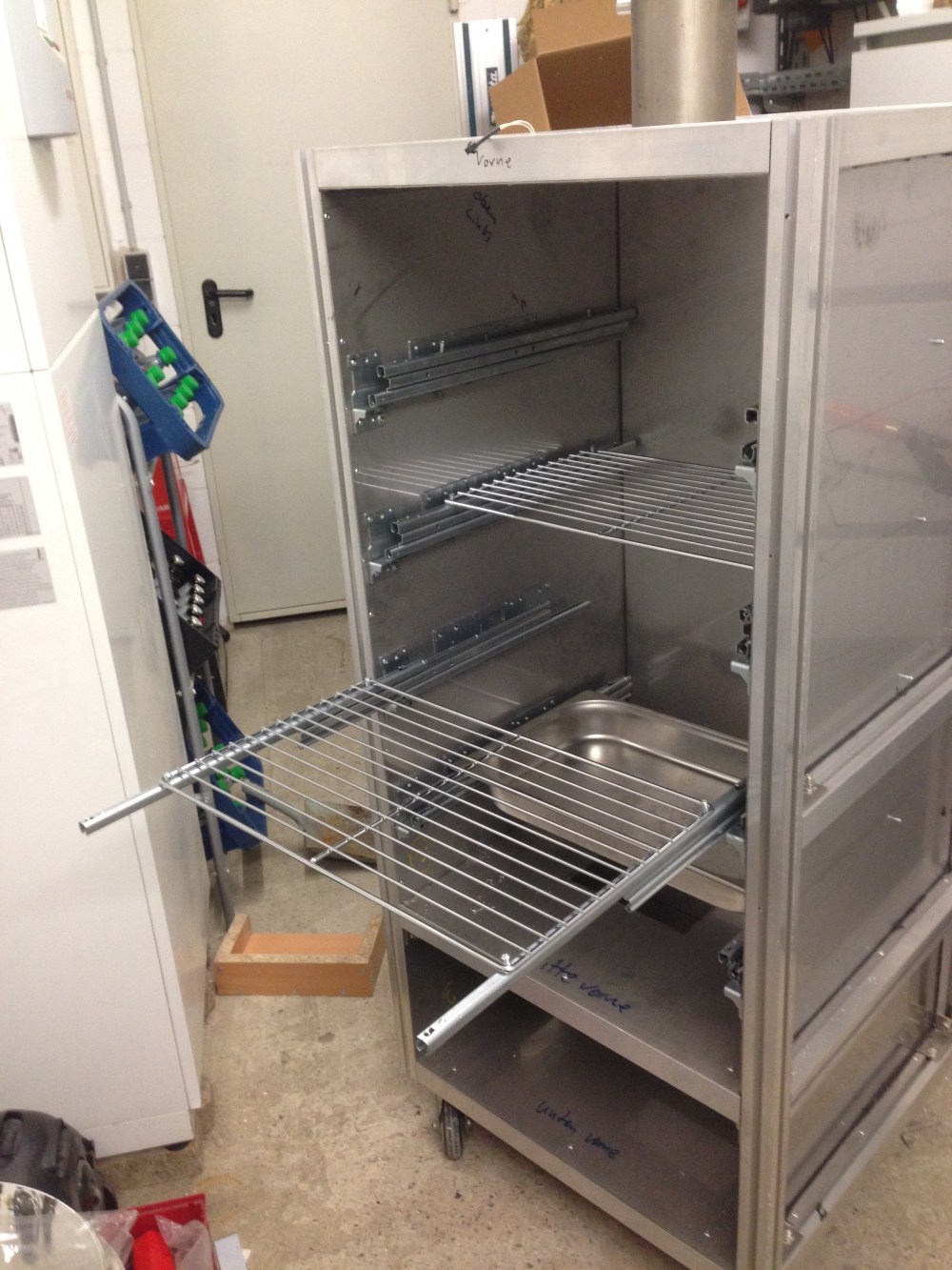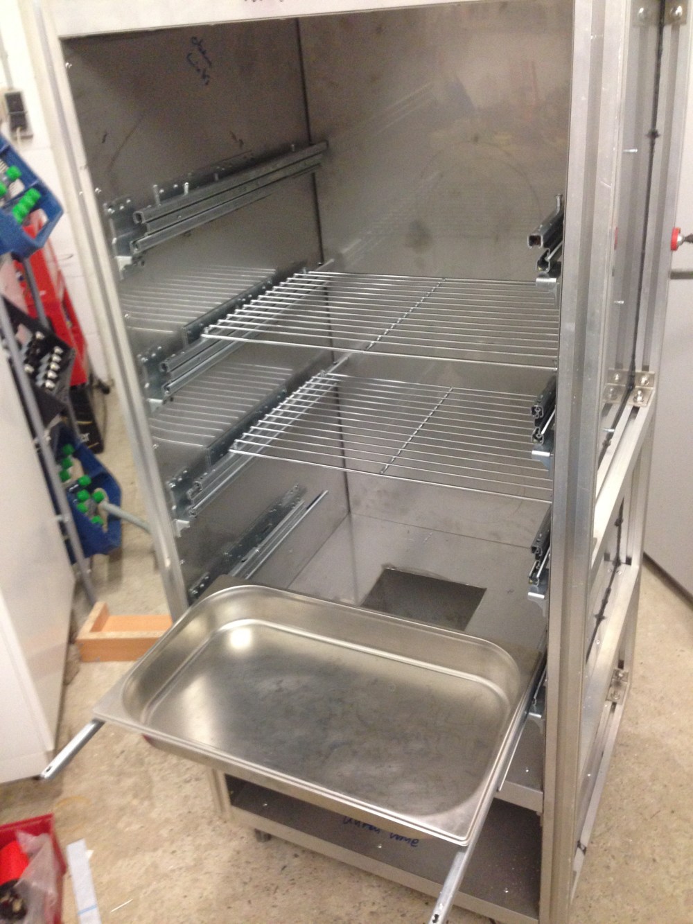 Hier möchte ich euch mal meinen Pelletsmokereigenbau vorstellen. Ich hatte keinen Bauplan, habe einfach angefangen. Ziel war es einen Pelletsmoker zu bauen, der auf den Betrieb mit GN Schalen und Rosten abgestimmt ist. Das Grundgerüst besteht aus Aluminiumprofilen, die eigentlich als Unterkonstruktion von Photovoltaikanlagen dienen. Beplankt wurde das Ganze mit geschliffenen 1,5 mm starken Edelstahlblechen, die mit Poppnieten befestigt wurden. Zwischen den Blechen wurde eine Isolierung aus 40 mm Steinwolle angebracht. Die Innenmaße sind mit einem Auszugsschienensystem der Firma Hettich ausgestattet, die für die Aufnahme von GN Rosten und Schalen der Größe 1/1 optimiert wurden. Das Pelletaggregat ist ein Pellet Hopper von Smoke Daddy Inc., den ich aus den USA importiert habe. (UPDATE: Mittlerweile bekommt man ihn in Europa mit 220V bei https://www.pelletgrill.rocks/) Der Smoker wurde von mir im Winter 2014/2015 gebaut, und leistet mir treue Dienste. Auch zum Kalträuchern von Wurst eignet er sich hervorragend . Aber Bilder sagen ja bekanntlich mehr als tausend Worte…;-)