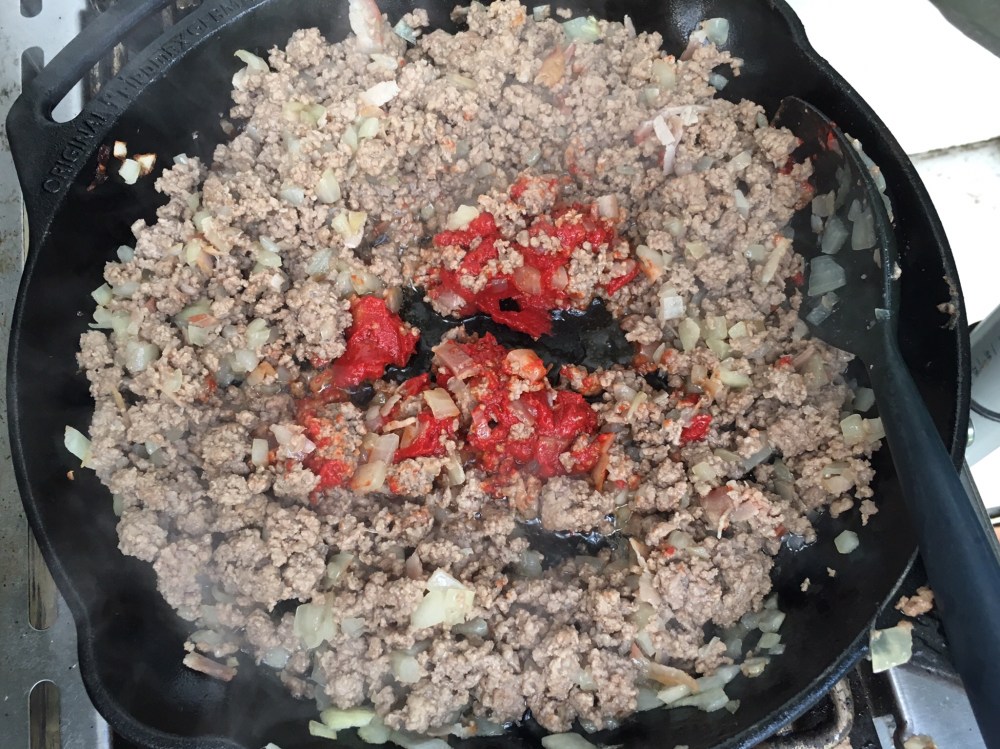 Die Zwiebeln und das Hackfleisch anbraten, Tomatenmark und Rub hinzugeben. Gemüse unterheben und kurz mitbraten.