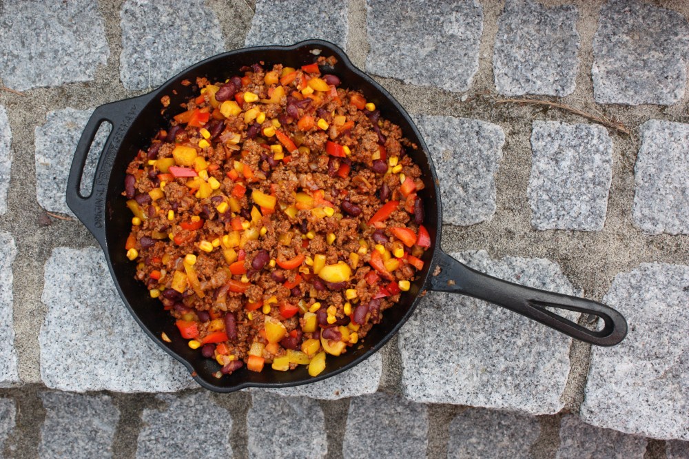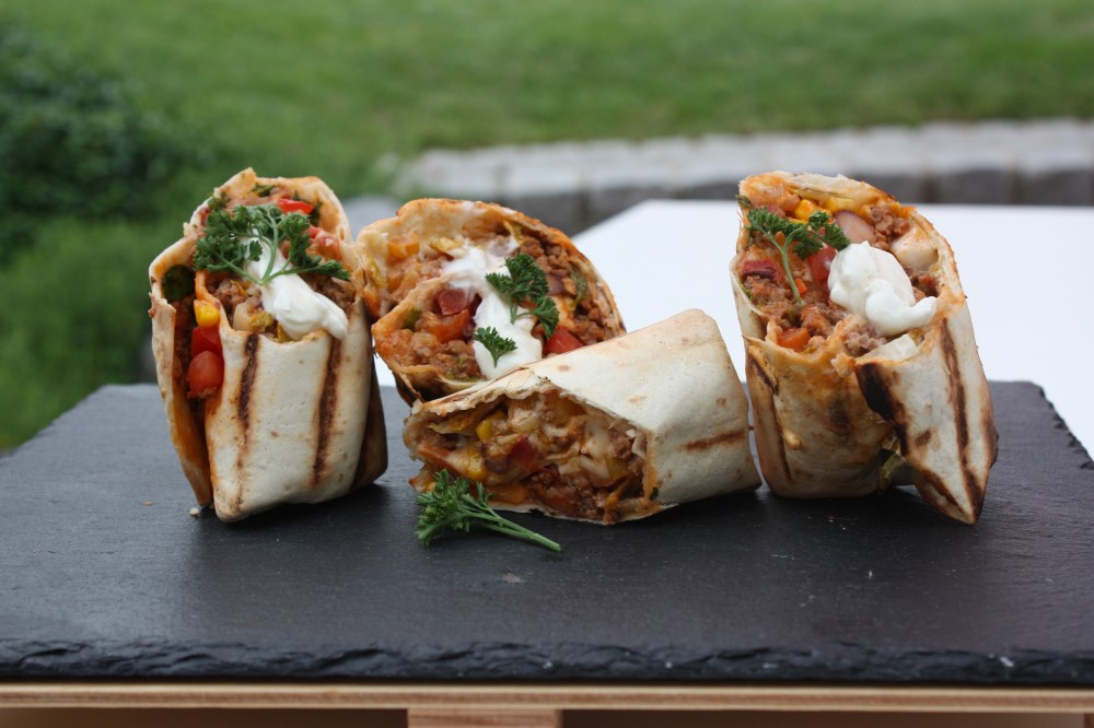 Die Zwiebeln würfeln und in einer Pfanne auf dem Seitenkochfeld des Gasgrills in einer Pfanne anbraten. Wenn die Zwiebeln glasig sind, das Hackfleisch dazugeben und mitbraten. Das Tomatenmark, Bohnen, Mais sowie die gewürfelten Paprikaschoten unterrühren und anschließend mit Don Marcos „Sombrero“ Rub würzen. Alles gut durchmischen und noch ein wenig schmoren lassen. Den Salat in Streifen schneiden und die Tomaten würfeln. Die Tortillas mit Sauerrahm bestreichen und den geriebenen Käse darüber geben. Die Hackfleischmasse, den Salat und die Tomaten auf den Käse geben und etwas Sauerrahm und Petersilie darauf verteilen. Wer mag, kann nun noch etwas Rub darüber streuen. Nun die kurzen Seiten der Tortilla einschlagen und eine der langen Seiten eng über die Füllung klappen. Aber aufgepasst: Nehmt nicht zu viel Füllung, damit ihr ihn noch richtig rollen könnt. Das Ganze zur offenen Seite eng aufrollen. Nun geht es ab auf den Grill. Im indirekten Bereich die leckeren Tortillas noch ca. zehn Minuten grillen, dabei einmal vorsichtig wenden.