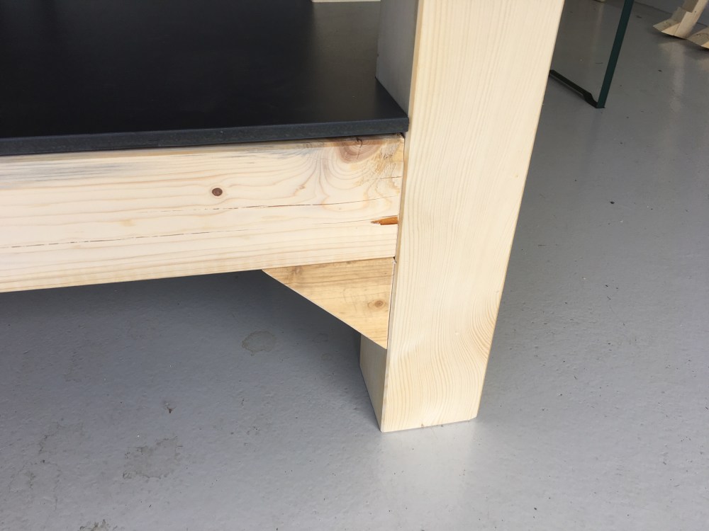 Die Tischbeine bestehen aus 120 X 120 mm Kanthölzern. Die Tischzargen aus 120 X 60 Kanthölzern.