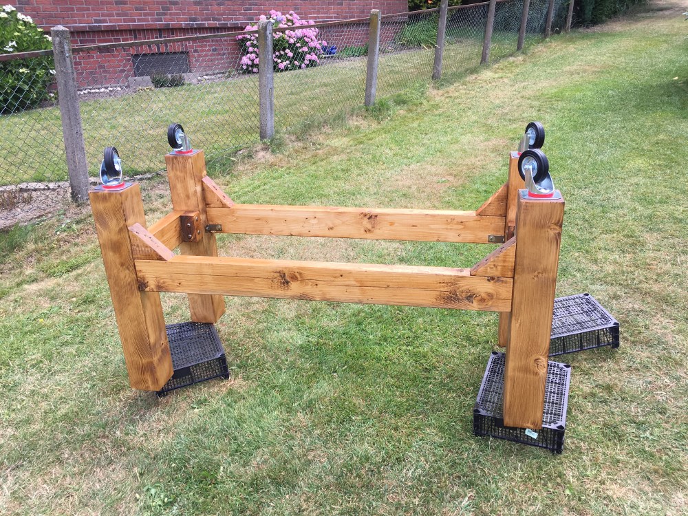 Hier ist der erste Anstrich mit Holzschutzmittel in der Farbe Nussbaum. Ebenfalls zu sehen sind schon die montierten Transportrollen.