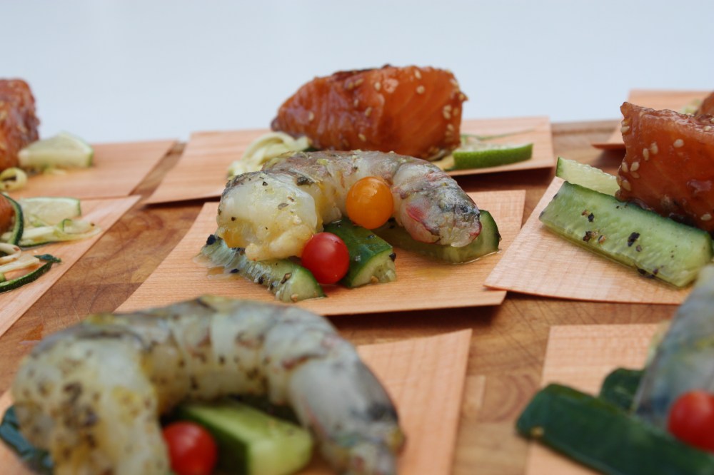 - mit Stonewall Kitchen „Citrus Ingwer Garlic Sauce“ marinierte Black Tiger Garnelen auf Gurkenstiften die mit Olivenöl und Ankerkrauts „Tonki Kong“ gewürzt wurden. Dazu ein paar Minitomaten.