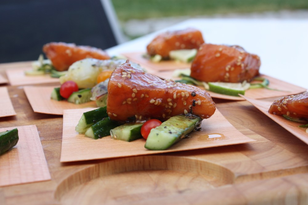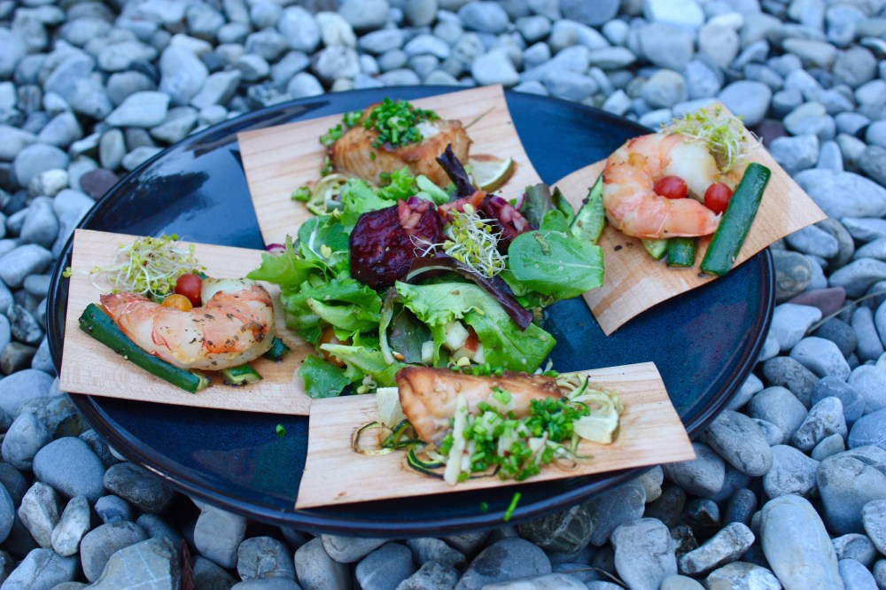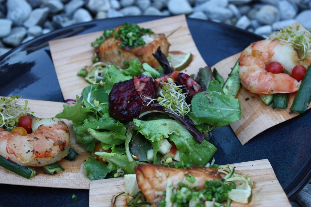 Der Lachs und die Garnelen inklusive Beilagen wurden auf Kirschbaum „Woodpaper“ bei 160 Grad ca. 20 Minuten indirekt gegrillt. Die Rote Bete wurde schon etwas eher auf dem Grill platziert. Die ca. 1 cm Scheiben wurden 45 Minuten im indirekten Bereich gegart.