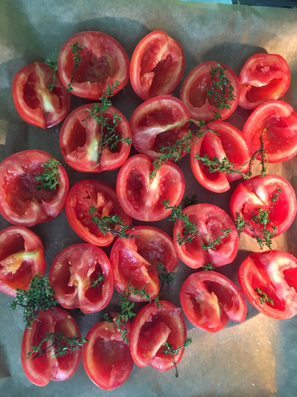 Die Tomatenhälften auf ein Backblech legen, mit etwas Meersalz salzen und ein paar Thymianzweige darauf verteilen.