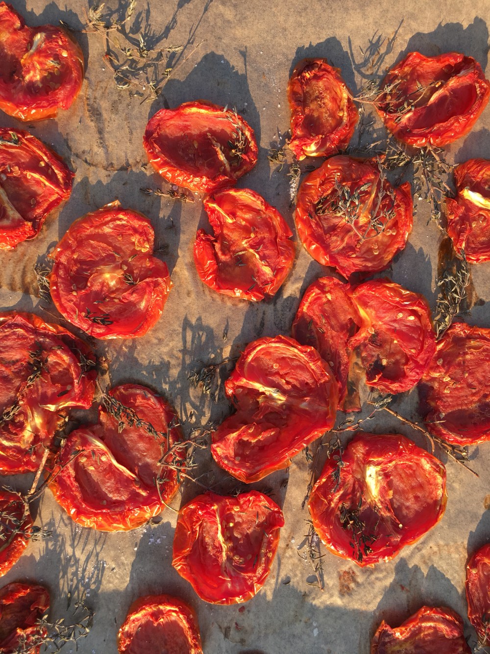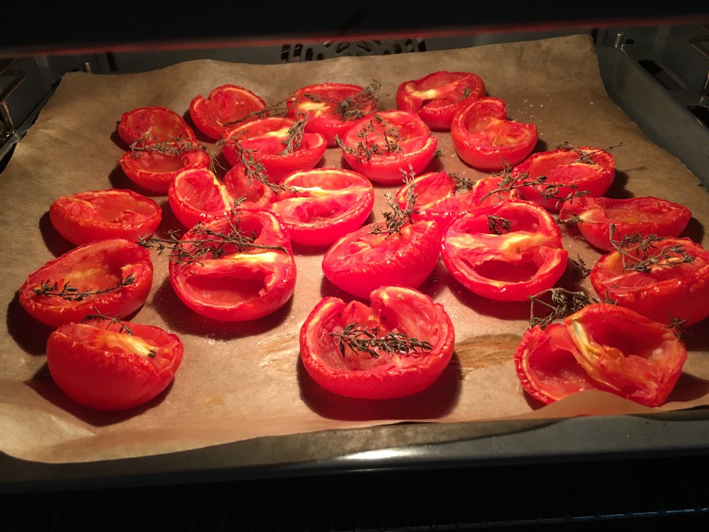 Da sind sie die fertigen getrockneten Tomaten. Nur noch die trockenen Thymianzweige entfernen, mit einem guten Olivenöl beträufeln und mit ein paar italienischen Kräutern abschmecken. Nun noch etwas ziehen lassen und genießen.