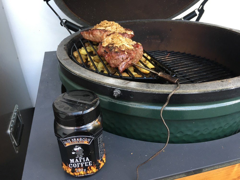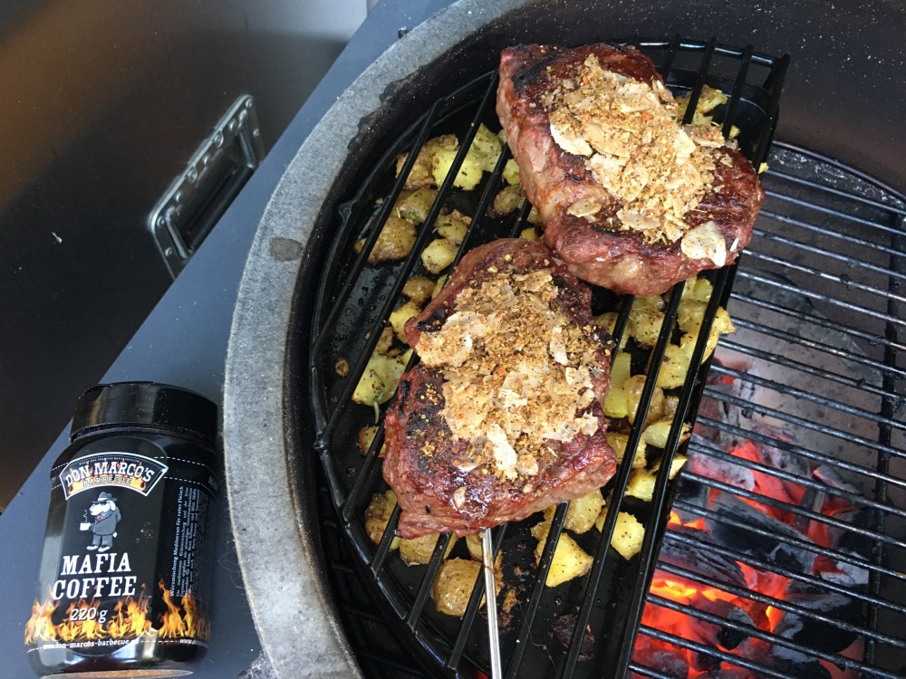 Die vorgekochten Kartoffeln wurden mit „Don Marcos Potato“ gewürzt und im indirekten Bereich angebraten. Die Steaks wurden zunächst über direkter Hitze scharf angebraten und anschließend im indirekten Bereich über den Kartoffeln plaziert.
