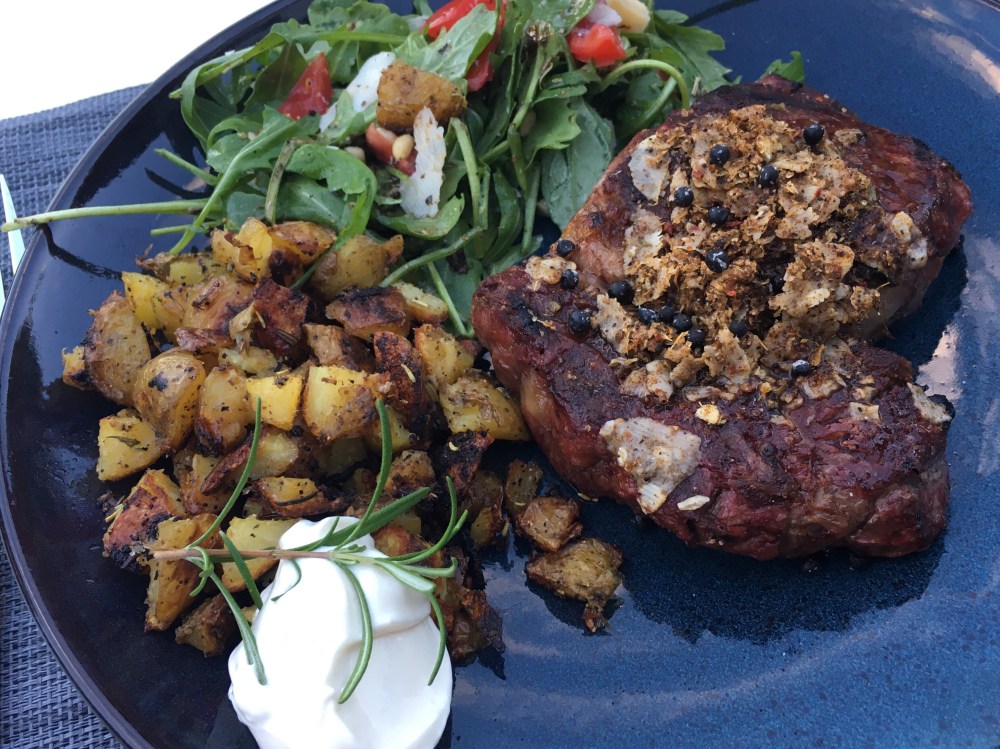 Und schon konnte angerichtet werden. Die Steaks bekamen als weiteres Highlight noch ein paar Körner vom fermentierten Pfeffer spendiert. Noch etwas Sourcreme zu den Kartoffeln, ein wenig frischen Rucolalalat und fertig ist ein leckerer Steakteller, der auch optisch etwas her macht.