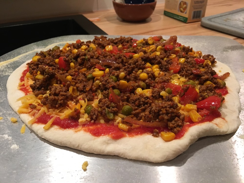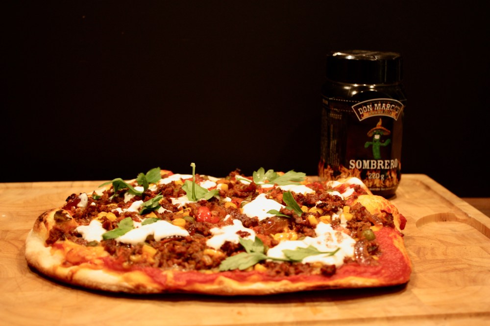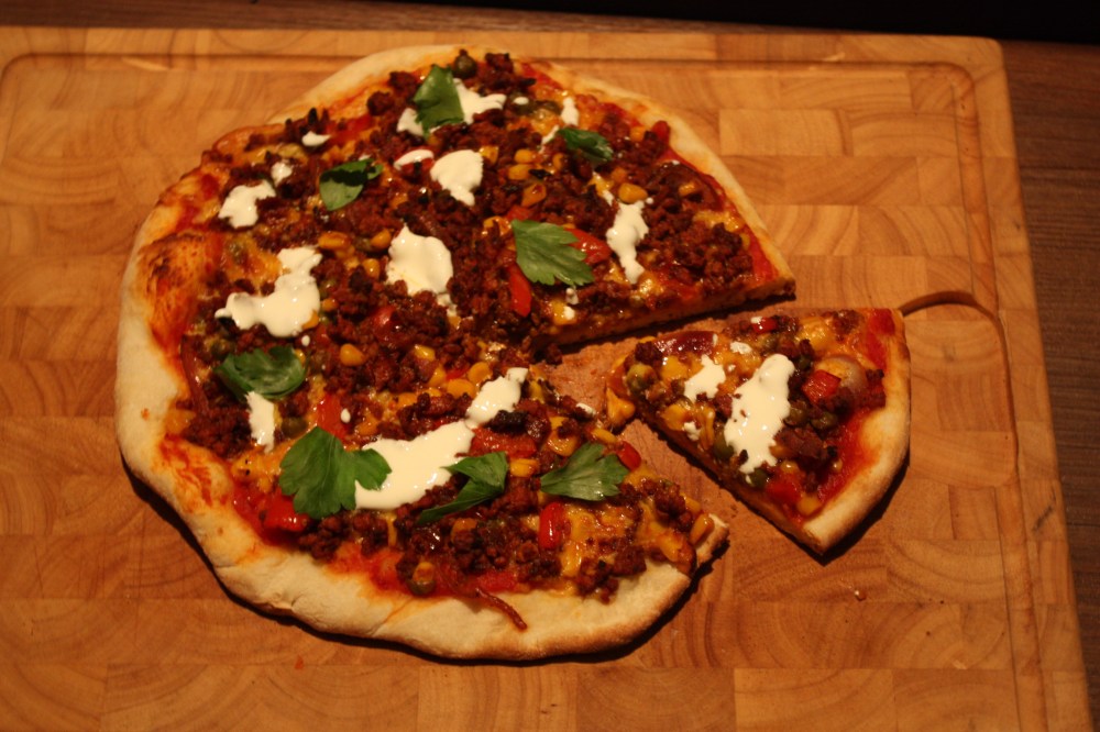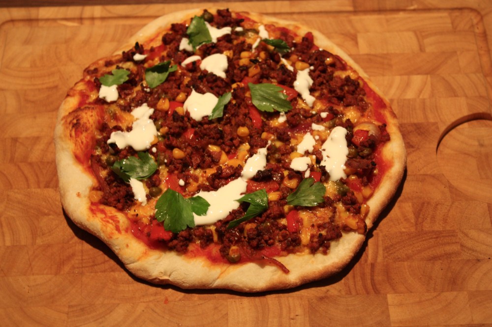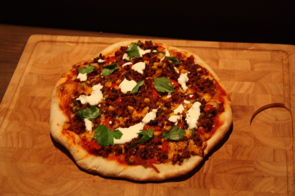 Manchmal sind es komische Zufälle, die einem am Grill und in der Küche kreativ werden lassen. Eigentlich hatte ich heute vor, ein schönes deftiges Chilli zu kochen, aber dann fiel mir im Supermarkt ein Paket Pizzamehl vor die Füße und folgende Idee war geboren: Eine deftige TexMex Pizza vom Big Green Egg sollte es nun werden.