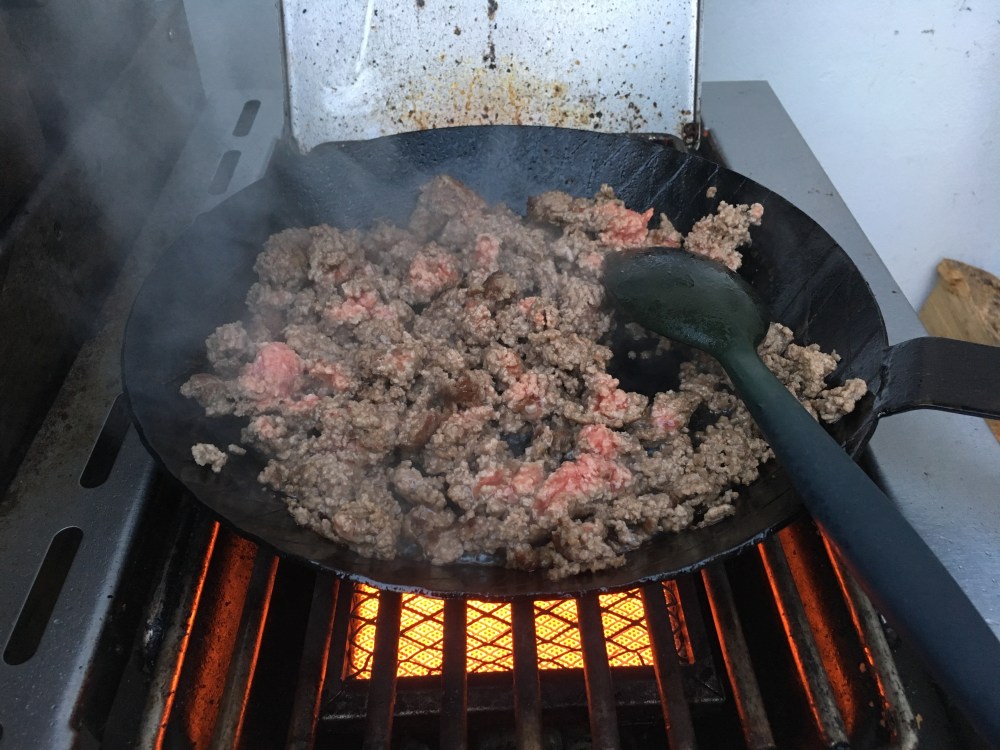 Jetzt kann der Belag für die Pizza zubereitet werden. Dazu wird das Hackfleisch scharf angebraten.