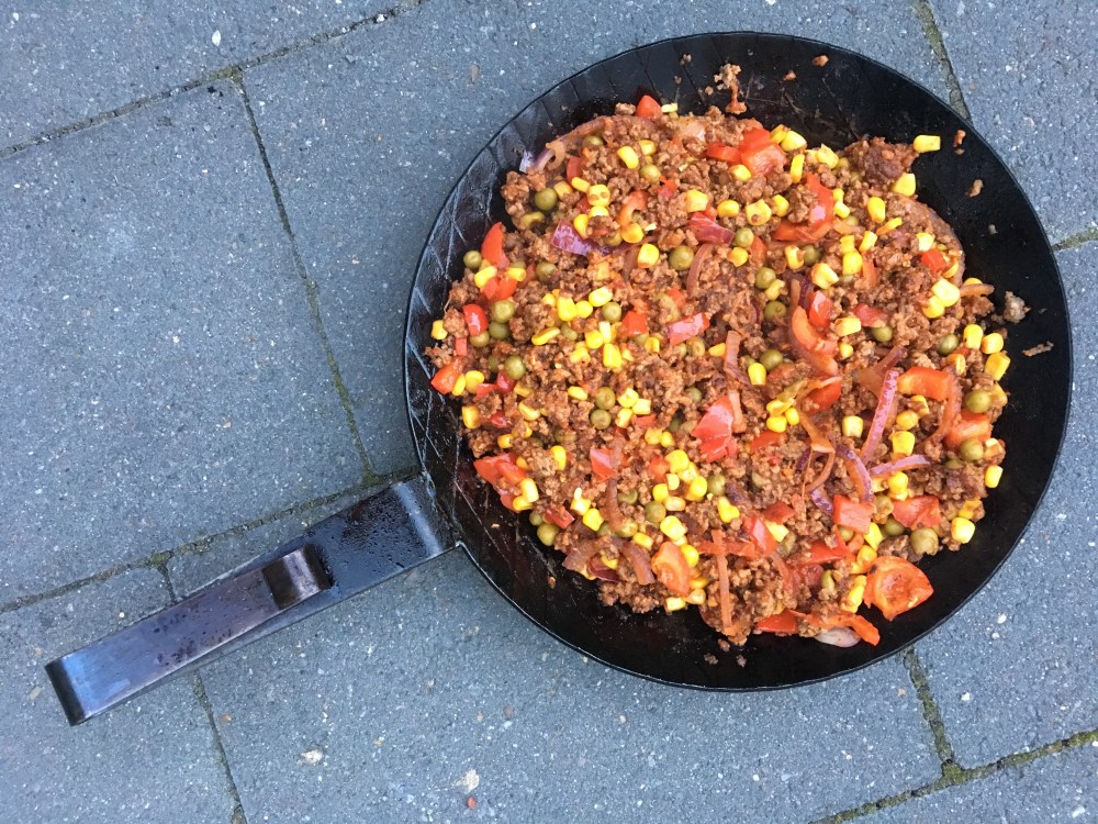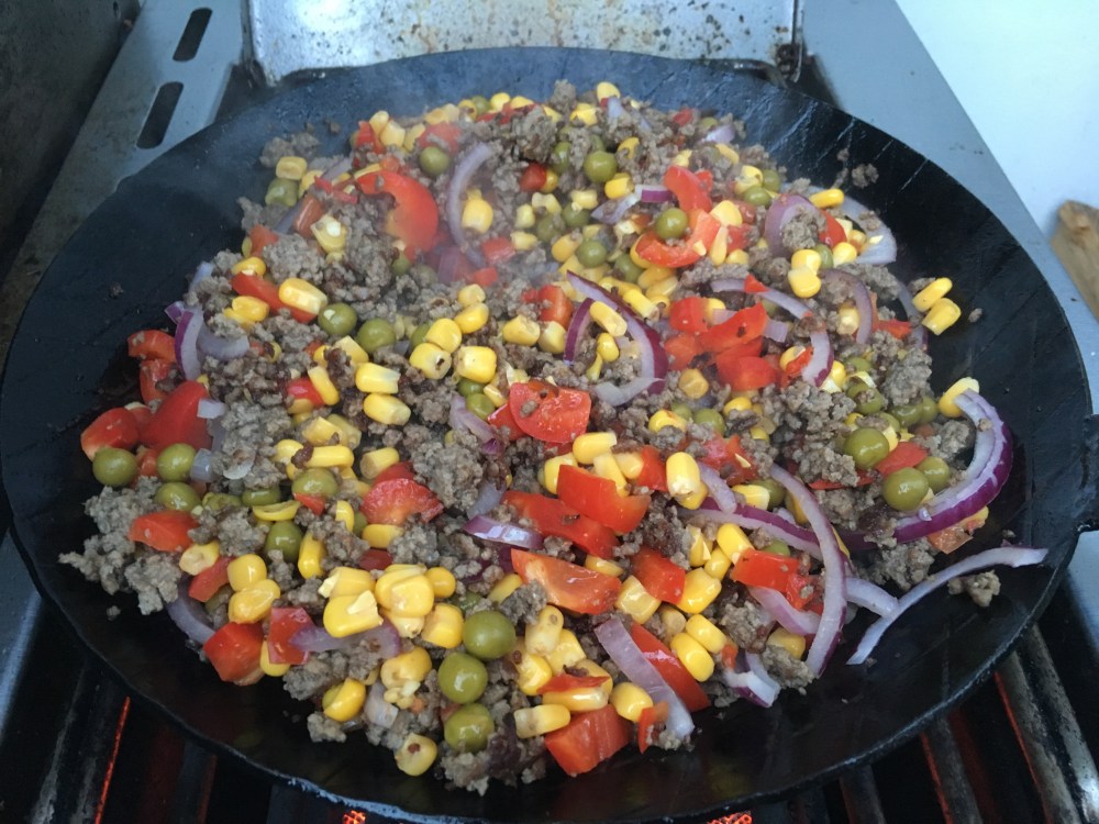Wenn das Hackfleisch schön Farbe angenommen hat, kommen eine gewürfelte Paprika und die in Scheiben geschnittene Zwiebel sowie das Dosengemüse dazu. Alles kurz mit anbraten und mit ca. 2 El Don Marcos Sombrero Rub würzen.