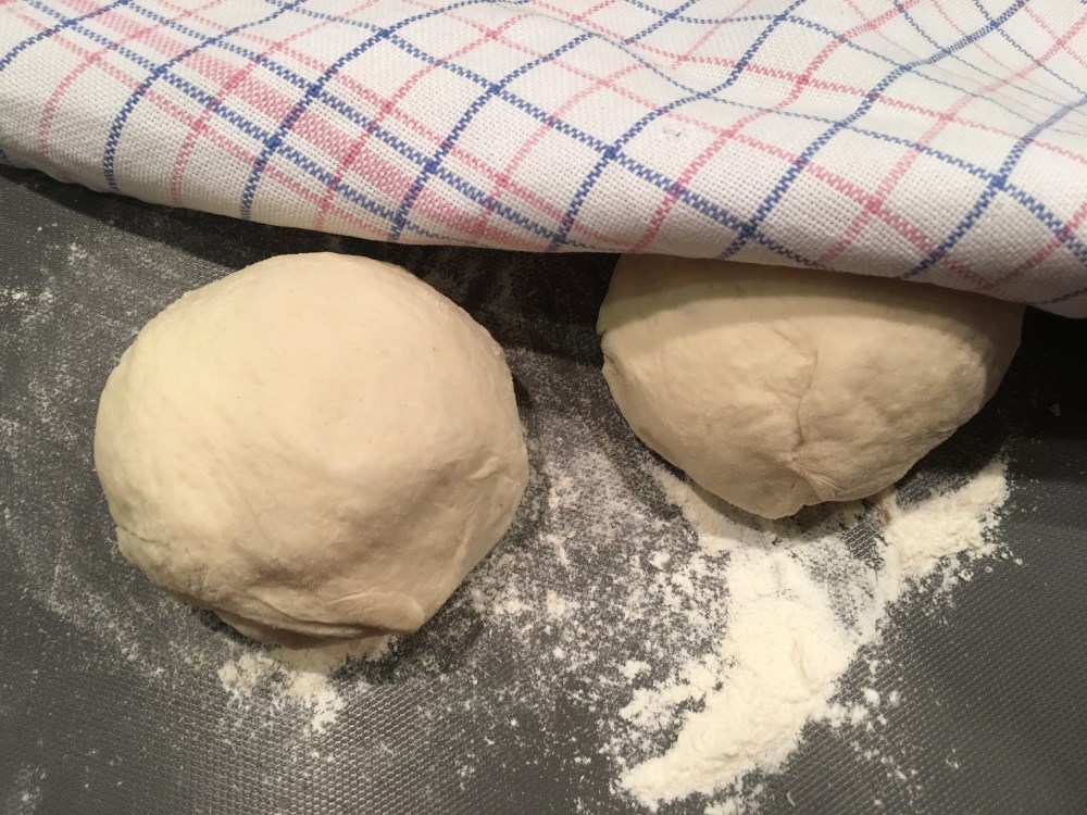 Die Hefe in ca. 85ml lauwarmen Wasser mit Zucker auflösen und ca.5 Minuten gehen lassen. Das Mehl in eine Schüssel geben. Mit der angerührten Hefe und den restlichen Teigzutaten zu einem glatten Teig verkneten. Den Teig abgedeckt ca. 20 Minuten an einem warmen Ort gehen lassen. Anschließend den Teig halbieren, zu zwei Kugeln formen und erneut ca. 30 Minuten abgedeckt gehen lassen.