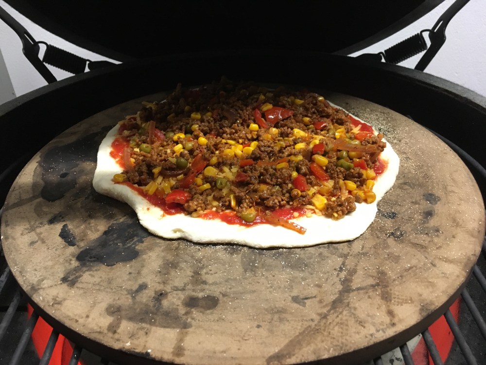 Nun wird die Hackfleischzubereitung auf dem Teig verteilt und die Pizza auf dem Big Green Egg ca. 10 Minuten bei 270 Grad mit Deflector auf einem Pizzastein gebacken.