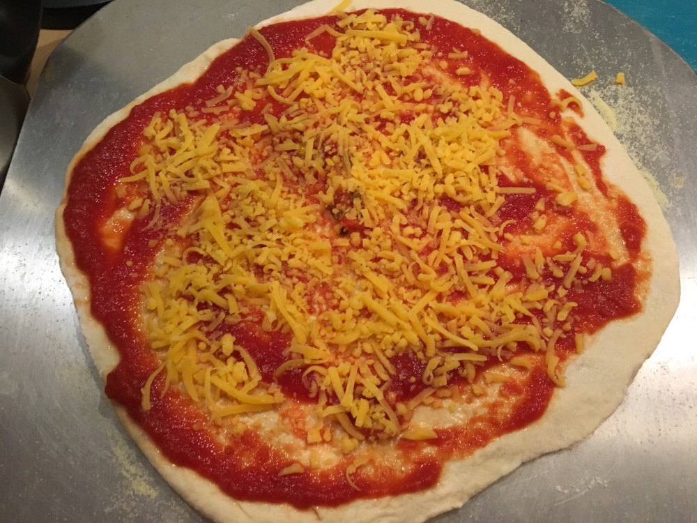 Nach der Gehzeit eine der Teigkugeln zu einem Fladen mit ca. 30cm Durchmesser ausrollen und mit Pizzasauce bestreichen und geriebenen Cheddarkäse darüber geben.