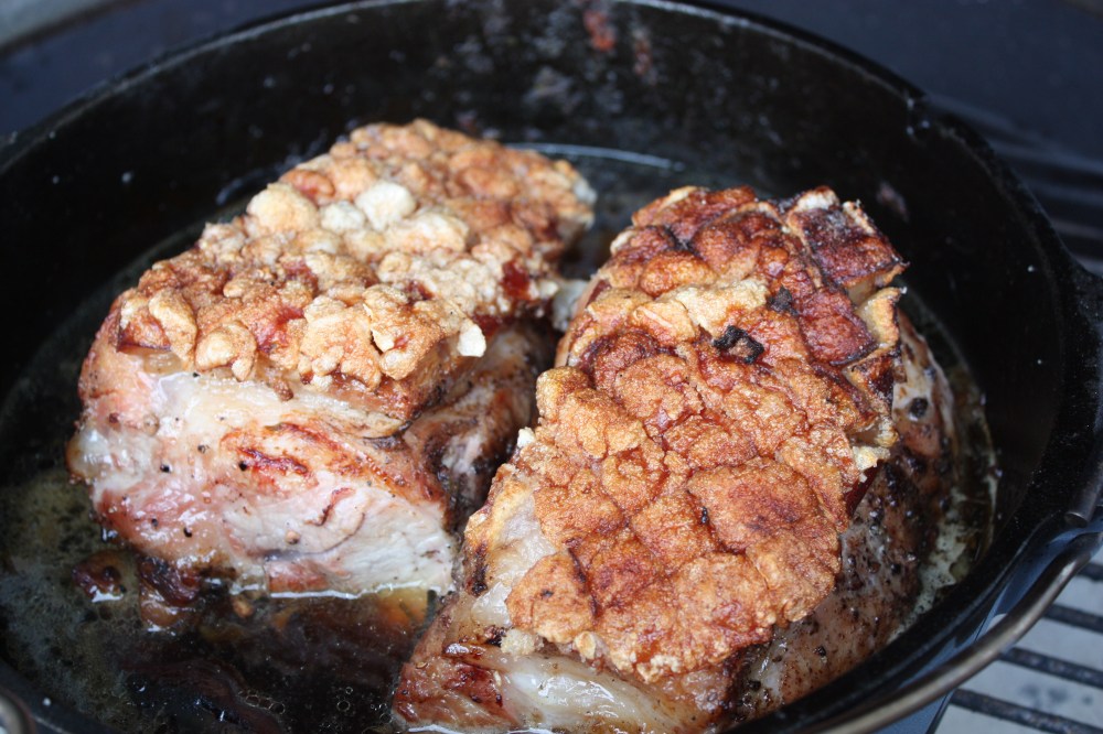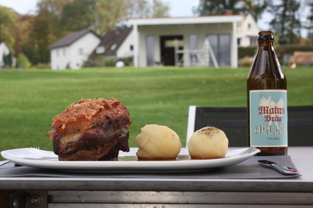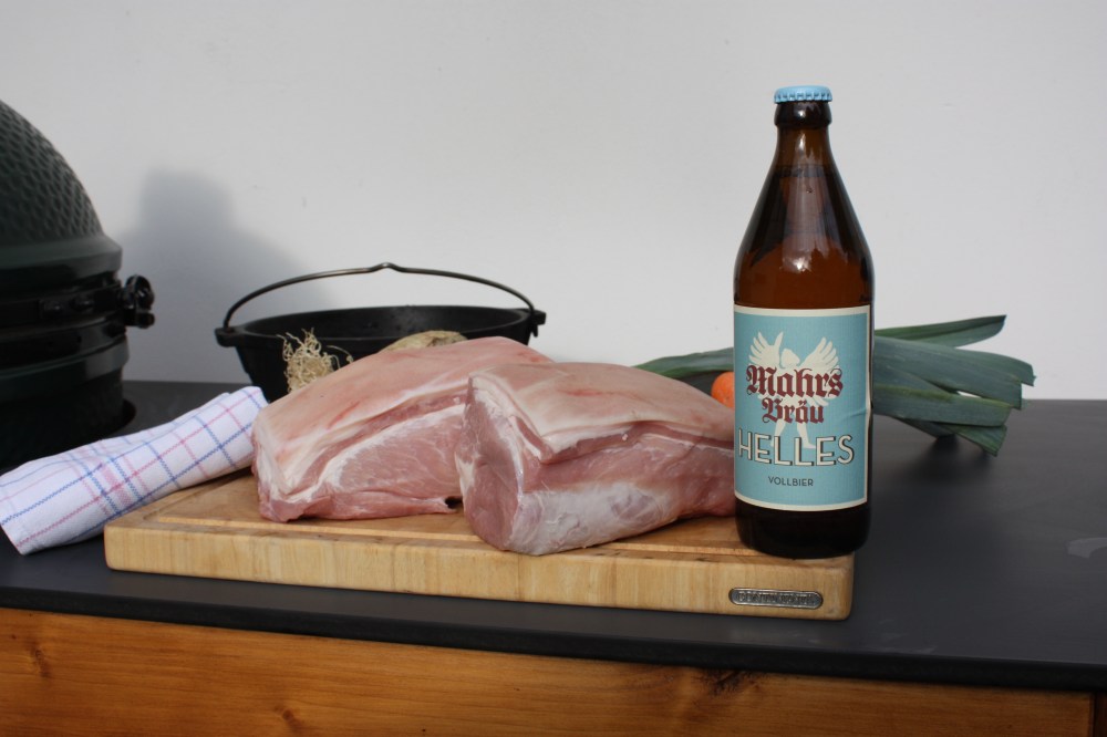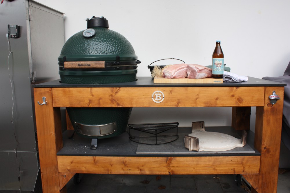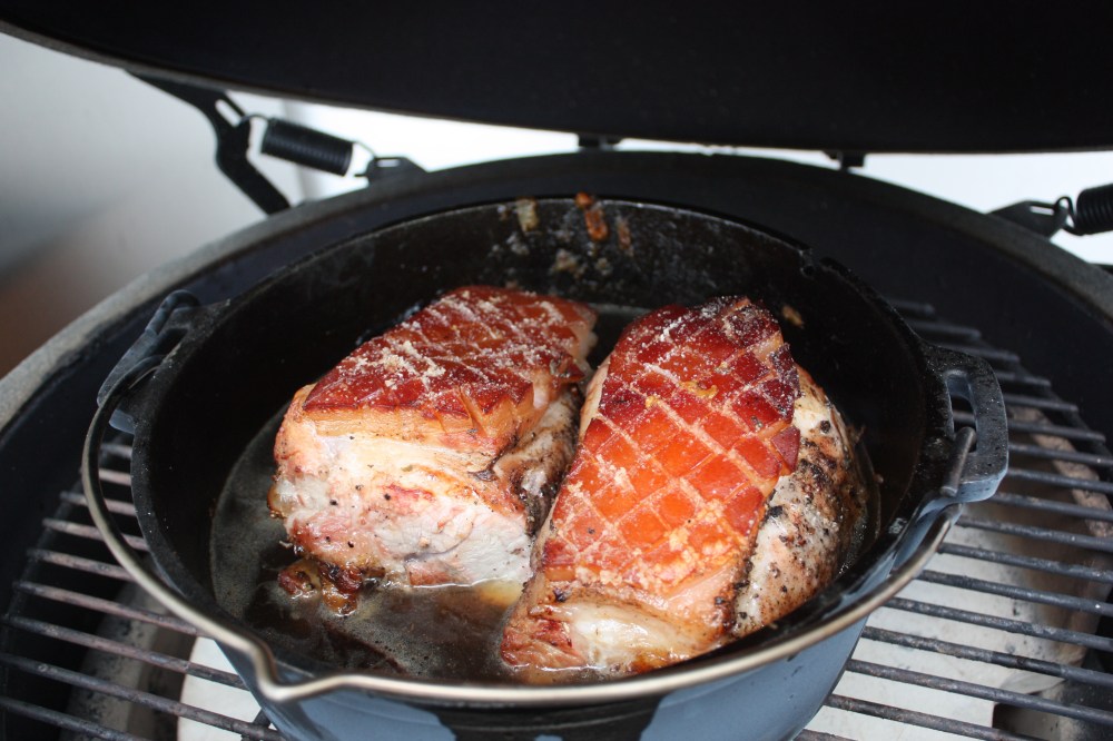 Im Frühjahr war ich mit ein paar Freunden im fränkischen Bamberg zu einem Wochenendtrip. Dort haben wir das fränkische Schäufele mit Knödeln kennen und lieben gelernt. Das Schäufele, Schäuferle, Schäuferla, Schäufala oder Schäufelchen ist der süddeutsche Name für die flache Schweineschulter. Für das fränkische Schäufele wird beim rohen Schulterstück mit Knochen und Schwarte die Schwarte kreuzweise eingeritzt, das Fleisch mit Salz, Pfeffer und Kümmel gewürzt, auf gewürfeltes Wurzelgemüse und gewürfelte Zwiebeln in einen Bräter gesetzt. Nun noch etwas Brühe und ein fränkisches Bier hinzugeben und alles für gut zwei bis drei Stunden im Grill oder Ofen braten. Beim fertigen Schäufele sollte sich das Fleisch leicht vom Knochen lösen und die Schwarte knusprig und goldbraun sein. Ein ehrliches, bodenständiges und superleckers Gericht. Endlich bin ich einmal dazu gekommen, selbst ein Schäufele auf dem Big Green Egg zuzubereiten.