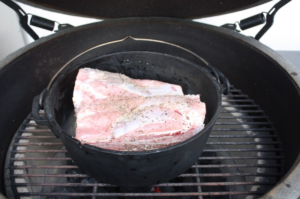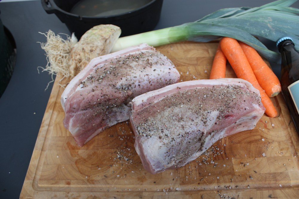 Die Grilltemperatur auf 180°C erhöhen. Das Fleisch aus dem Bräter nehmen, umdrehen, die Schwarte mit einem scharfen Messer rautenförmig einritzen und gut mit Salz einreiben. Ebenso das Gemüse nun mit in den Dutchoven geben und alles zusammen weitere ca. 2,5 Stunden mit geschlossenem Deckel garen. Währenddessen 2-3 mal die Soße mit dem Bier aufgießen.