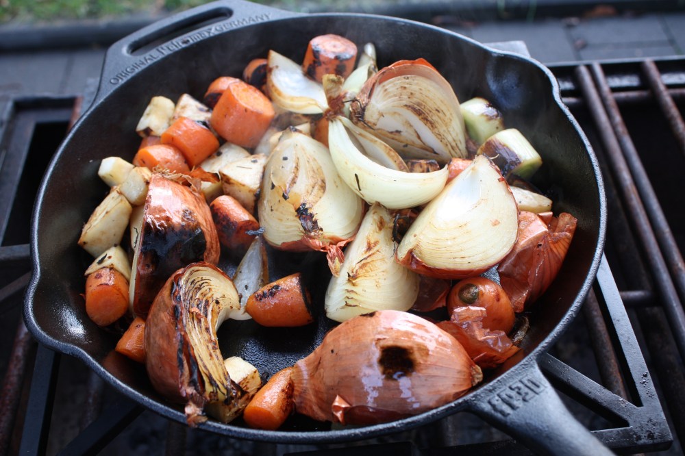 Nach drei Stunden die Soße mit dem Gemüse aus dem Dutchoven nehmen (wichtig, es sollte noch etwas Flüssigkeit im Bräter beim Fleisch bleiben) und die Schäufele für ca. eine halbe Stunde bei 220°C ohne Deckel rösch grillen. Wichtig ist, dass die Schwarte schön aufpoppt. Währenddessen die Soße aufkochen lassen, Gemüse absieben und nochmals mit den Gewürzen sowie dem Bier abschmecken.