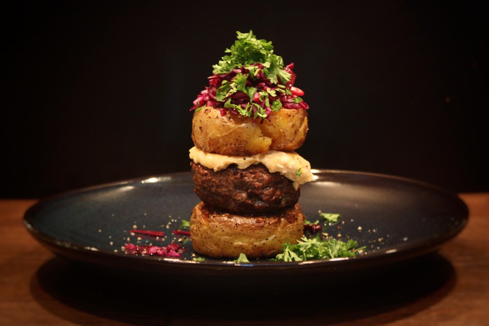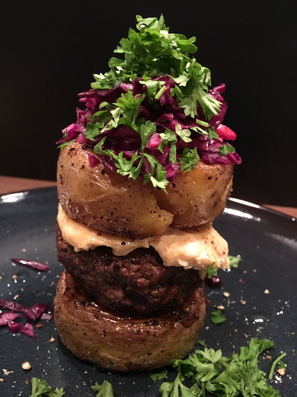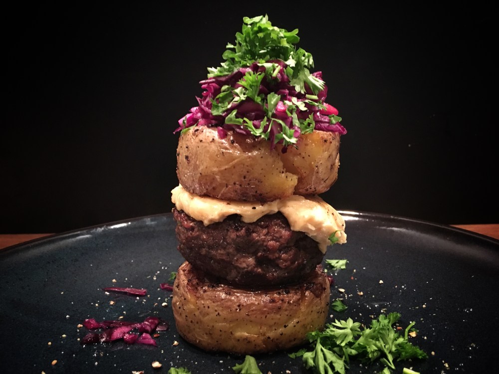Anrichtering auf einem Teller platzieren, eine Kartoffelhälfte aus der Pfanne nehmen und fest in den Ring drücken, ein wenig Mayonnaise daraufgeben. Ein gegartes Fleischpatty darauflegen, andrücken und den Ring abziehen. Etwas Mayonnaise auf das Fleisch geben, dann eine zweite Kartoffelhälfte auf das Fleisch drücken. Zum Schluss mit etwas Rotkohlsalat und Petersilie toppen. Nun noch etwas Pfeffer aus der Mühle und ein paar Tropfen Wallnussöl über den Teller träufeln und anschließend genießen.