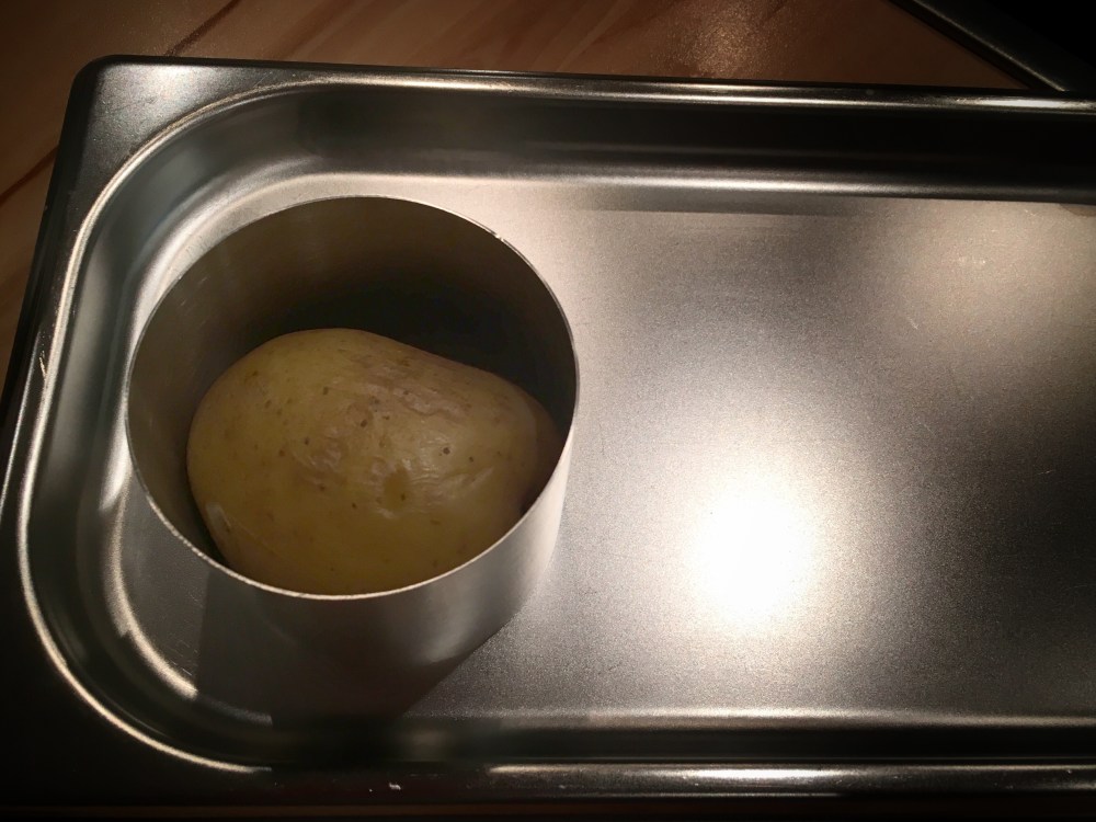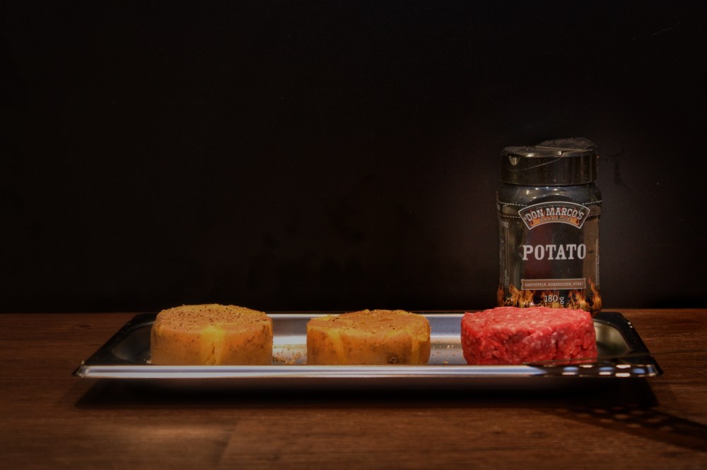 Die Kartoffeln nach dem Kochen portionsweise in den Anrichtering geben und noch heiß darin platt drücken. Auf diese Weise 8 Kartoffelplatten Buns herstellen und diese leicht mit Olivenöl einpinseln und salzen. Optional die Kartoffelplatten zusätzlich beidseitig mit Don Marcos „Potato“ Rub würzen.