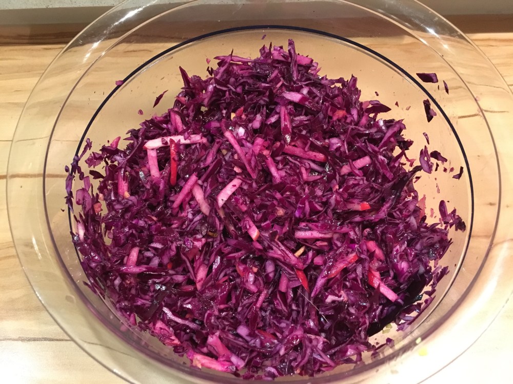 Mit Walnusslöl, Balsamico, Honig, 1 Prise Salz und etwas frischem Pfeffer würzen. Den Salat kräftig durchkneten, bis sich Flüssigkeit bildet. Dabei am besten Handschuhe tragen, da der Kohl färbt. Nochmals abschmecken, beiseitestellen und durchziehen lassen.