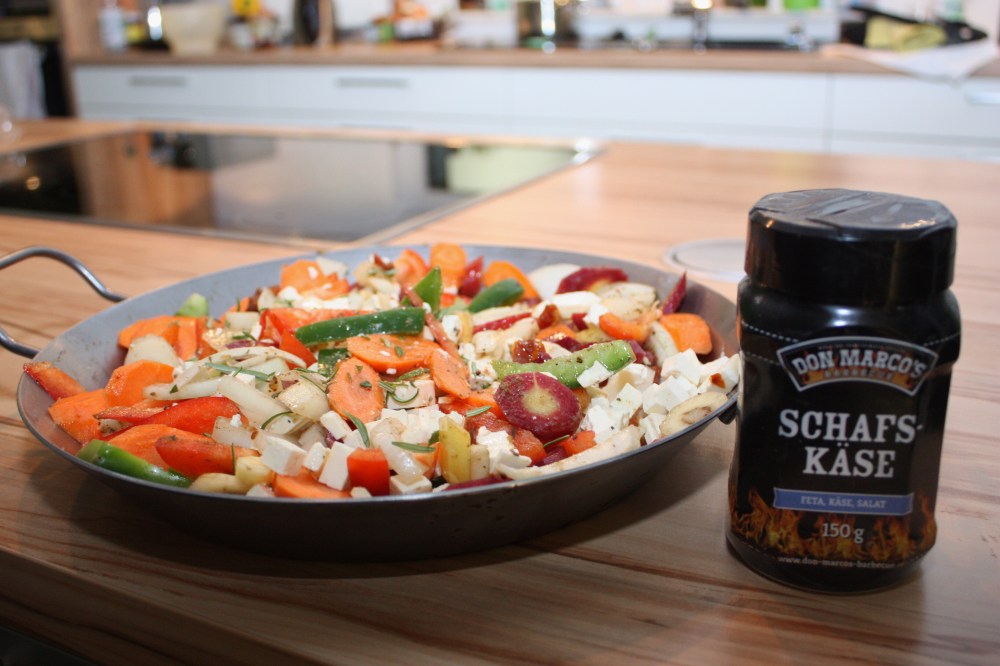 Für das Grillgemüse die Paprika und den Feta würfeln, die Möhren in Scheiben und die Zwiebel in halbe Ringe schneiden. Mit Olivenöl beträufeln und das Schafskäsegewürz dazugeben. Gut durchmischen und in eine Auflaufform oder Pfanne geben. Ready to grill!