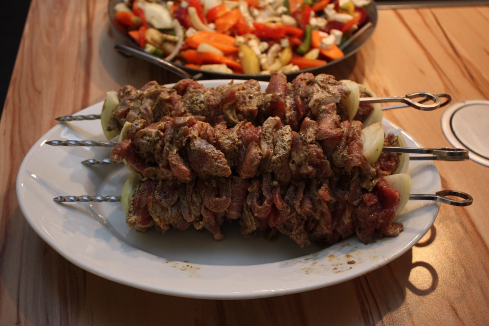 Am nächsten Tag kann das ganze Gericht vorbereitet werden. Für die Spieße die geschälten Zwiebeln vierteln und je ein Stück auf die Spieße stecken. Nun die marinierten Fleischstücke auf den Spieß stecken. Zum Abschluss wieder ein Zwiebelstück aufstecken. Das war es auch schon. Die Spieße sind nun startklar zum Grillen.