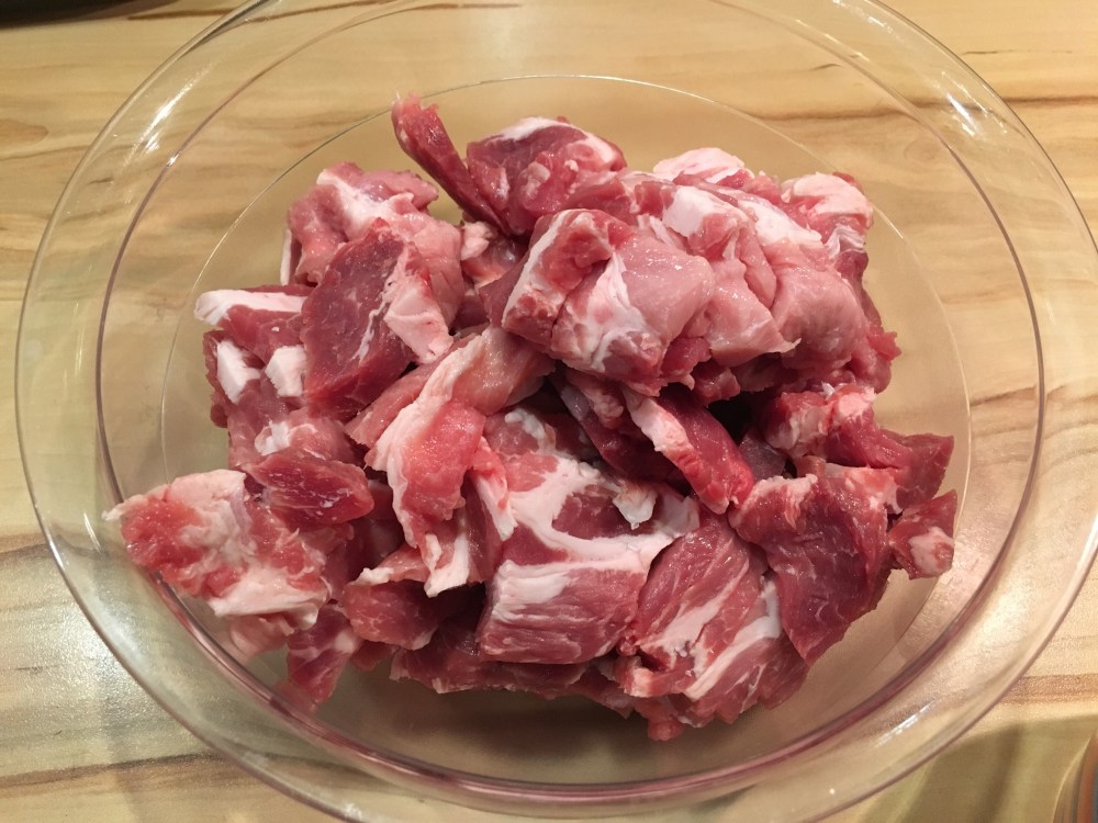 Den Schweinenacken leicht anfrieren, damit man ihn besser schneiden kann. Anschließend das Fleisch in ca. 3-4 mm starke Scheiben schneiden. Die Scheiben dann in ca. 4 cm X 4 cm Stücke Schneiden und in eine Schüssel geben.