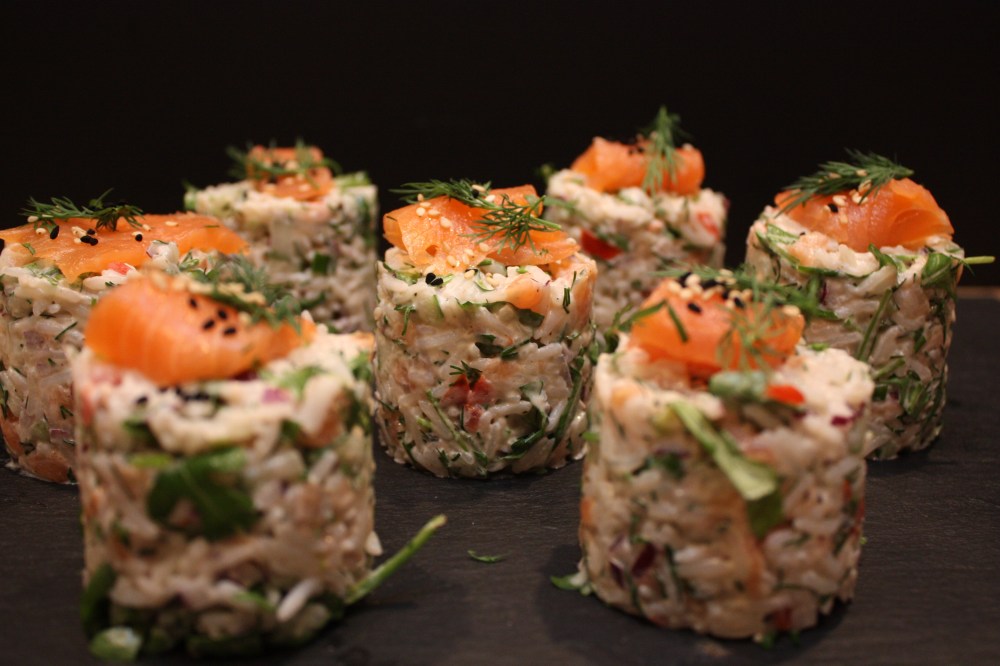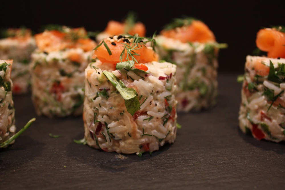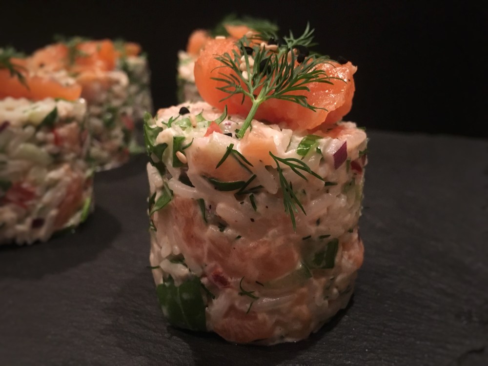 Als erstes den Reis kochen und anschließend auskühlen lassen. Den Lachs bis auf einen kleinen Rest erst in feine Streifen schneiden und anschließend würfeln. Der übrig gelassene Lachs wird später zum Verzieren benötigt.