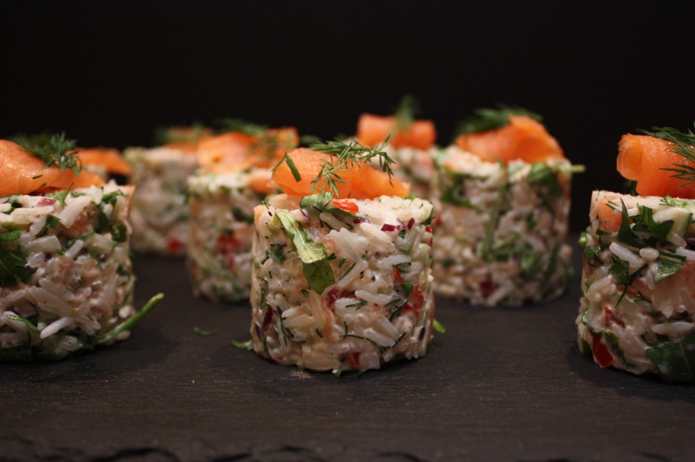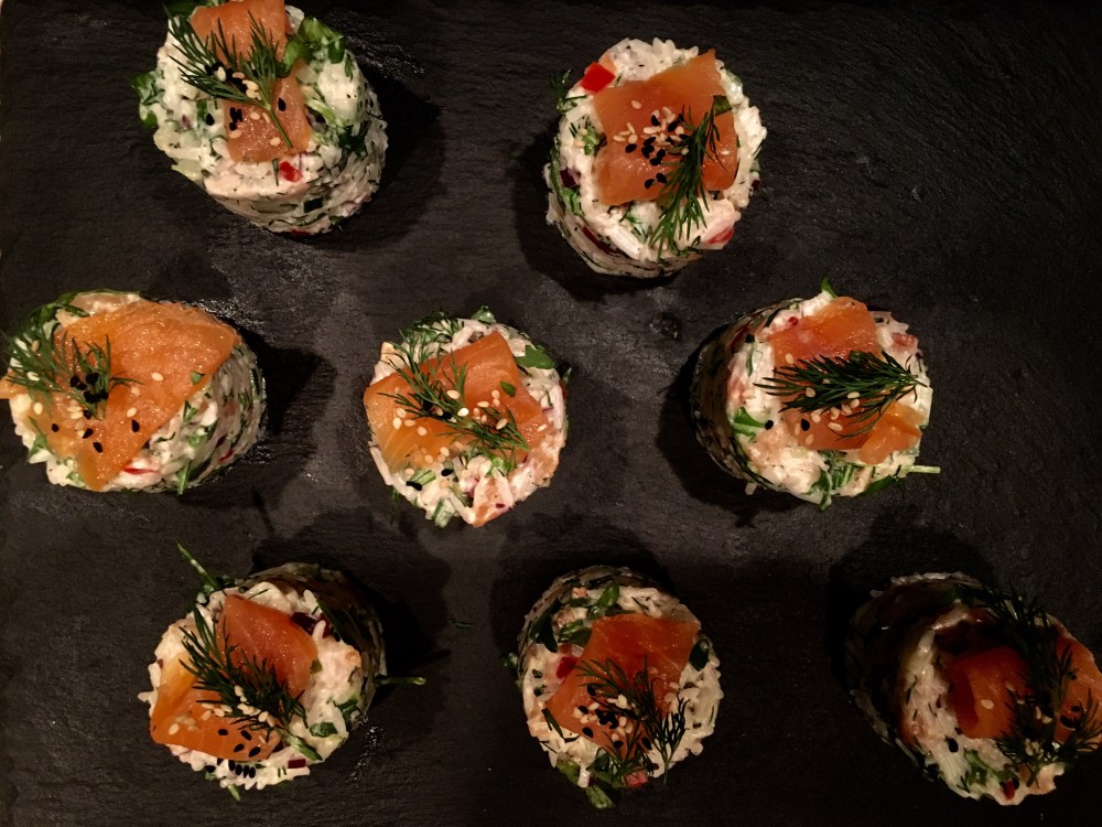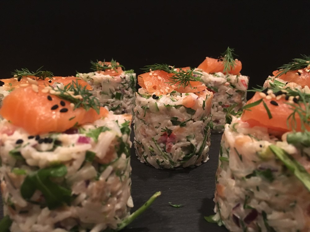 Die Masse mit Hilfe von Dessertringen auf einer Platte anrichten und mit Lachsscheibchen und Dillzweigen verzieren. Wer möchte, kann auch noch etwas weißen und oder schwarzen Sesam darüber streuen.