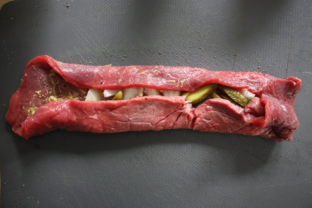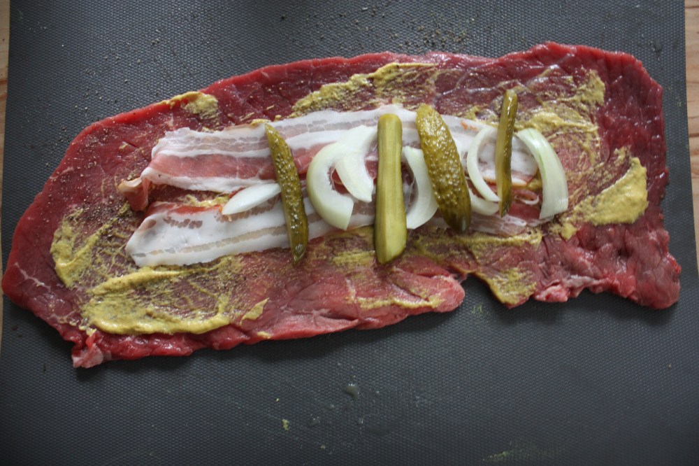 Die Rouladen wurden beidseitig gesalzen und gepfeffert, mit Senf eingestrichen und mit jeweils 2 Scheiben Speck bzw. Bacon belegt. Darauf kamen anschließend Zwiebelstücke und Gewürzgurkenstreifen.