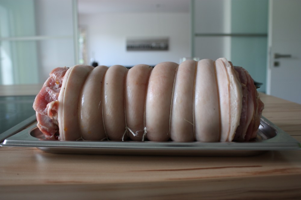 Jetzt den Bauch mit der durchgezogenen Paste auf der ganzen Breite einstreichen und von der Fleischseite (hier links) aufrollen und mit einer Bratenschnur in ca. 2 cm Abständen stramm zuschnüren.