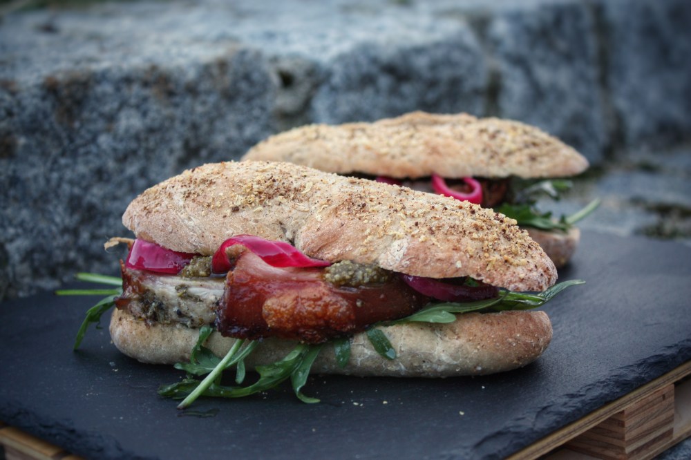 Belegt wurden die Baguettes mit Rucola, Braten, den abgetropften Zwiebelringen und etwas Pesto. Hier noch ein paar Pics von den leckeren Porchetta Baguettes.