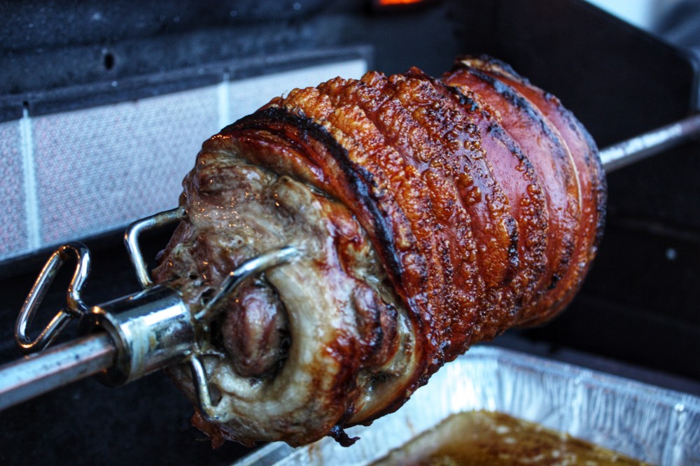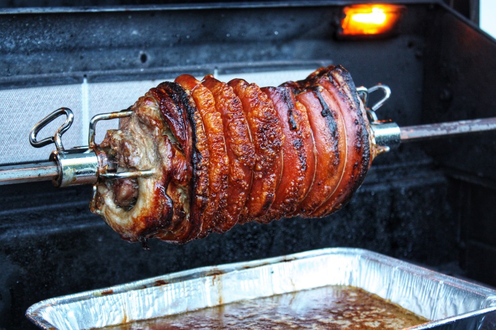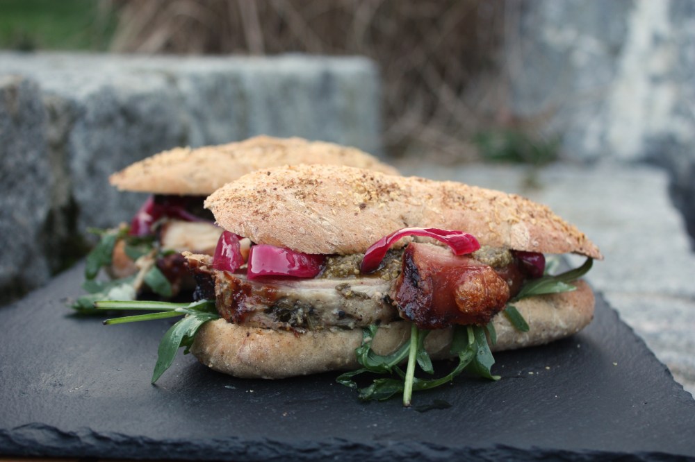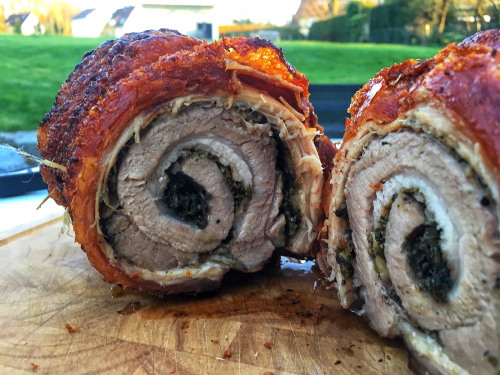 Eine gute und würzige Porchetta auf dem Grill zuzubereiten ist nicht schwer. Man benötigt dafür lediglich ein Grillgerät mit Deckel und eine Rotisserie. Ich habe meine Porchetta auf meinem Napoleon LE3 mit dem Backburner zubereitet. Serviert habe ich das Ganze in einem Hafer-Parmesan Baguette, das ich mit Hilfe des Monolith Brotbaukasten gebacken habe. Belegt wurde es mir Rucola, Porchetta, Pesto und süß-sauer eingelegten roten Zwiebeln.