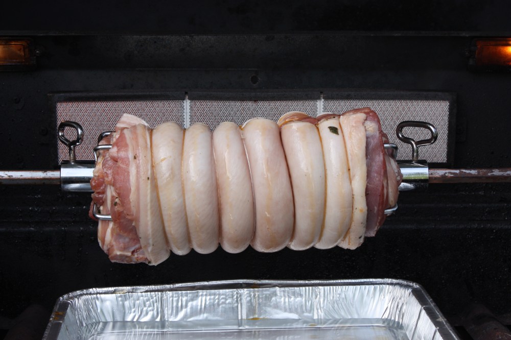 Anschließend den Rollbraten auf dem Spieß platzieren und mit den Halteklammern fixieren. Den Grill mit dem Backburner auf kleinster Stufe anheizen ( ca. 180 Grad) und den Spieß einhängen.