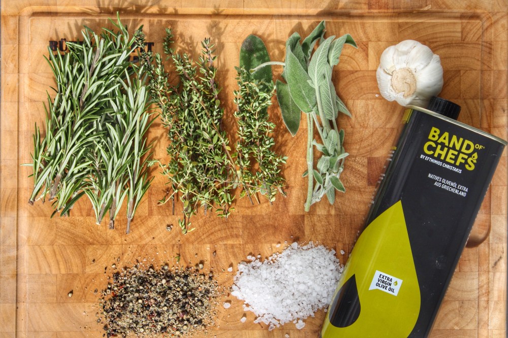 Als erstes wird die Würzpaste hergestellt. Dazu habe ich die Rosmarin- und Thymianblätter von den Zweigen abgestreift und zusammen mit den Salbeiblättern klein gehackt. Pfeffer und Salz habe ich zusammen mit den anderen Gewürzen im Mörser zerkleinert. Nun die Kräuter und den gepressten Knoblauch dazugegeben und zusammen mit den Limettenzesten, etwas Limettensaft und dem Olivenöl durchmengen und zu einer Paste verrühren, zum Durchziehen beiseite stellen .