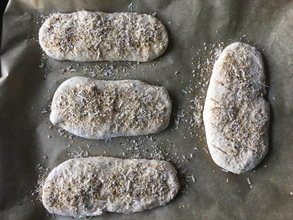 Für die Baguettes habe ich die Monolith Brotbackmischung „Leichtes Haferbrot“ verwendet. Als Topping kam ein Rest von der Senfbrot Backmischung, gemischt mit geriebenen Parmesan zum Einsatz. Den Teig habe ich genau so zubereitet, wie in diesem Rezept.