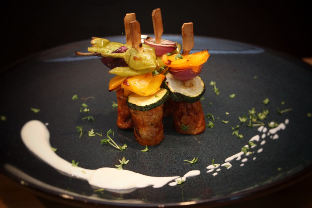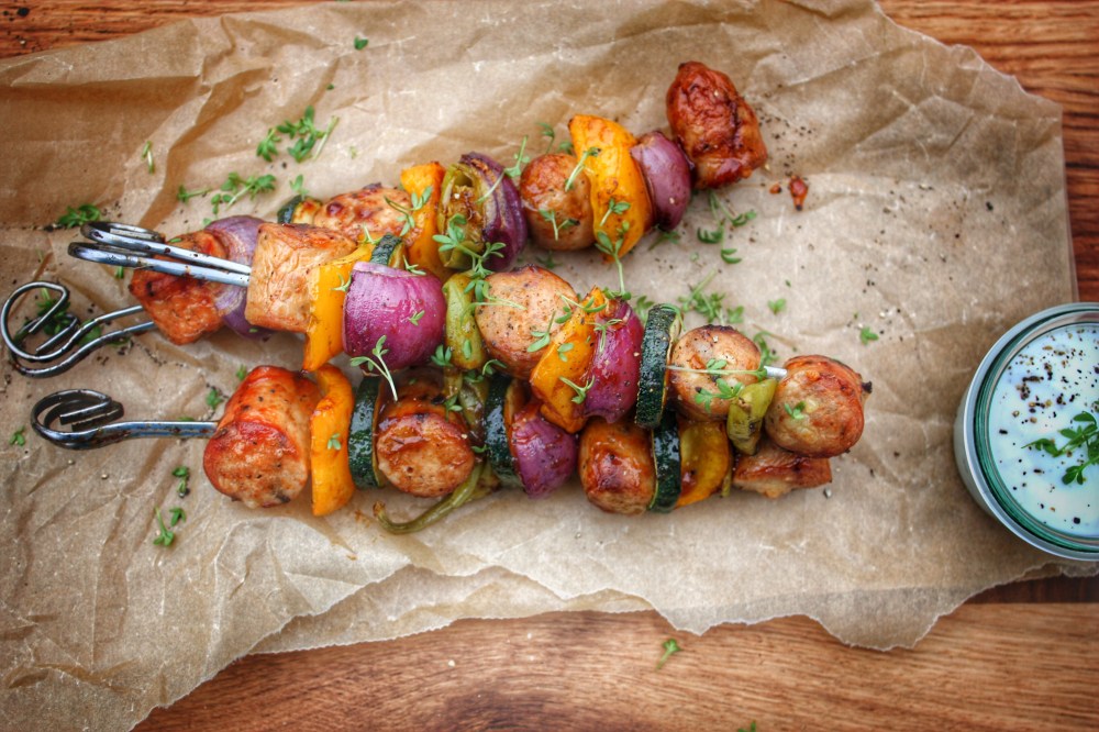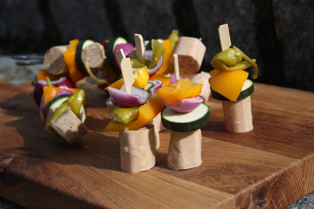 Zusammen mit Zwiebel, Zucchini und Peperonis lassen sich so schnell leckere Bratwurstspieße als Fingerfood herstellen.