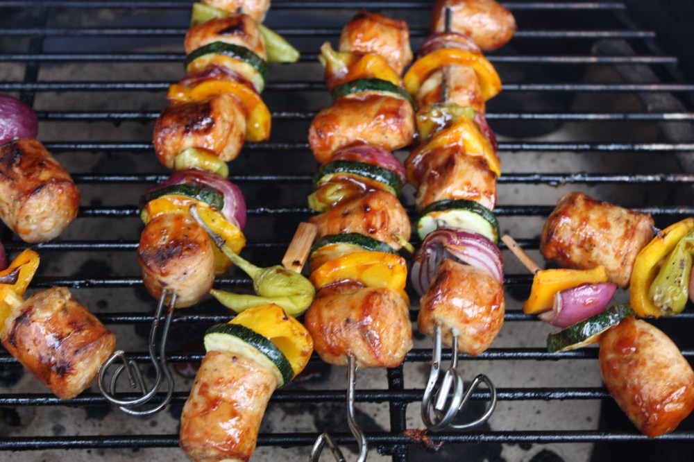 Fertig sind die Spieße, wenn die Wurst schöne Röstaromen bekommen hat und die BBQ-Sauce karamellisiert ist.