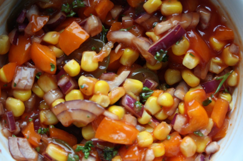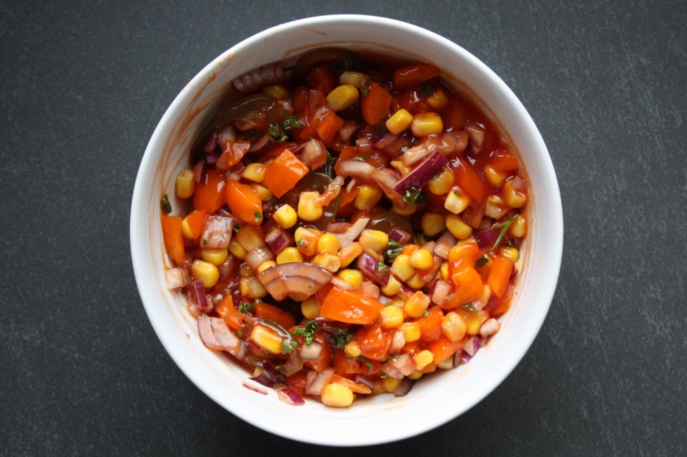 Für die Salsa die Zwiebel und die Paprika fein würfeln und den Mais sowie die Jalapeñoscheiben hinzugeben. Jetzt noch den Ketchup und den Rub unterrühren und fertig ist eine knackige, frische und leicht scharfe Salsa. Ich finde sie mega!