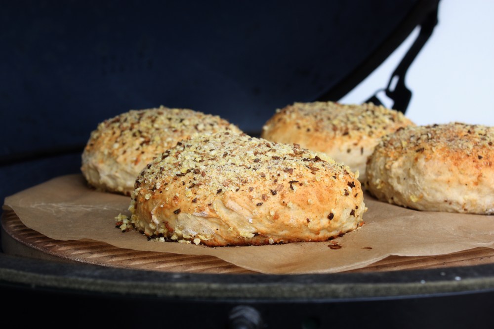 Im Grill oder Ofen bei 180 Grad ca. 35-40 Minuten backen, bis sie etwas Farbe annehmen. Mit einem Handtuch abgedeckt auf einem Kuchengitter auskühlen lassen, dadurch werden die schön weich
