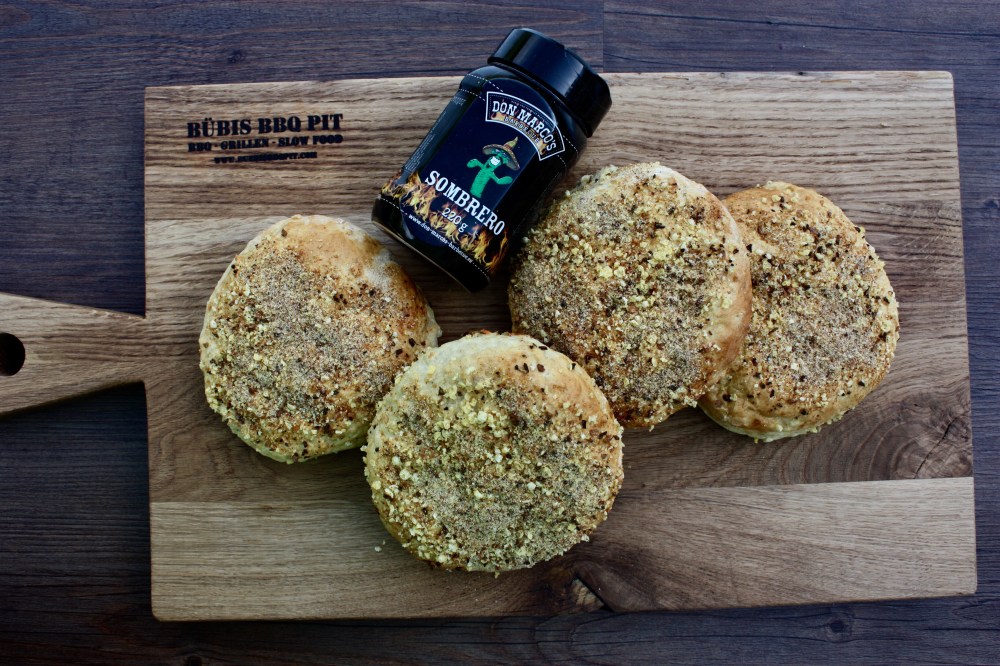 Die Teiglinge schön rund schleifen und abgedeckt an einem warmen Ort weitere 45 Minuten gehen lassen. 2 El Wasser mit 2 El Mich und einem Eiweiß verrühren, die Buns damit einstreichen und mit der Mischung aus den Maisflocken und dem Sombrero Rub bestreuen.