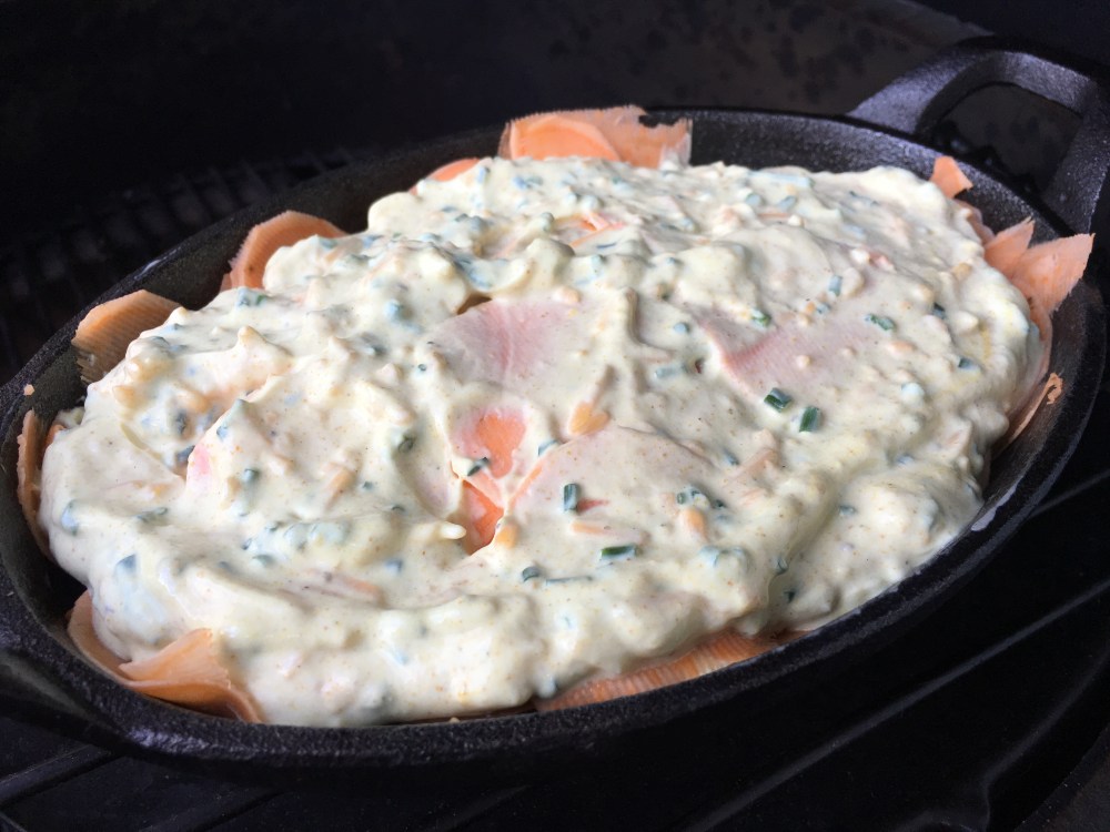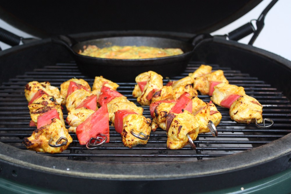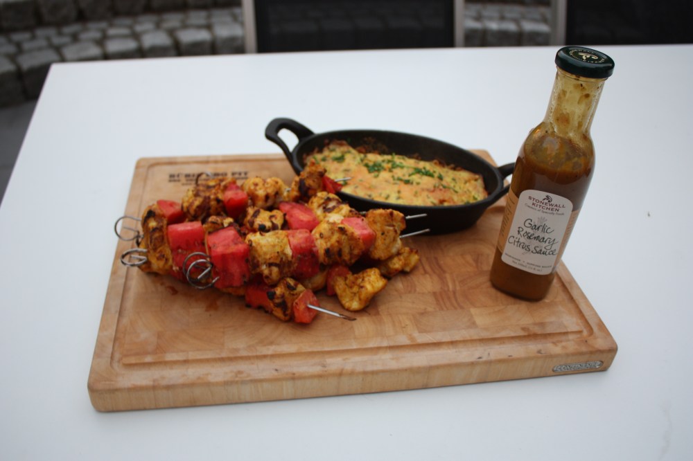 Die Süßkartoffeln schälen und mit einem Gemüsehobel in dünne Scheiben hobeln. Die Sahne mit Pfeffer und Salz würzen und über die in einer Auflaufform platzierten Kartoffelscheiben geben. Nun den Schmand mit gehackten Schnittlauch vermischen, darüber geben und mit dem Mozzarella bestreuen. Das Gratain im Grill ca. 30-40 Minuten bei 170 Grad garen, bis die Kartoffeln weich sind. Die Spieße im Grill angrillen und im indirekten Bereich gar ziehen. Dazu passt hervorragend die „Stonewall Kitchen – Garlic Rosmary Citrus Sauce“.