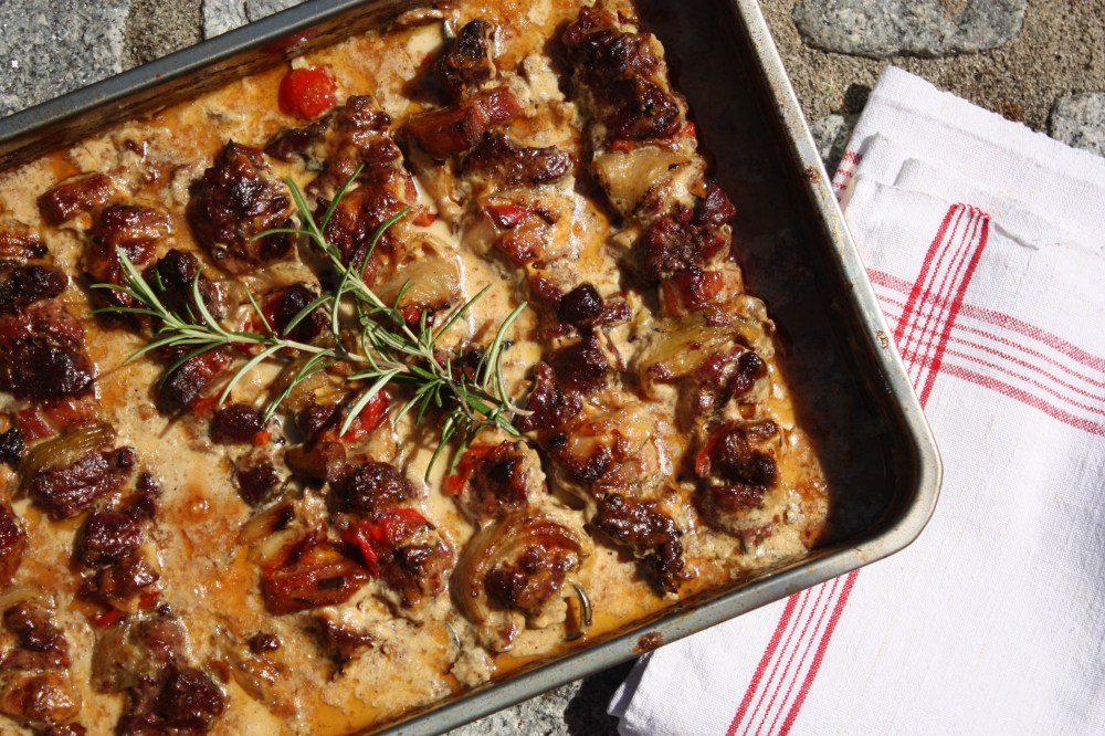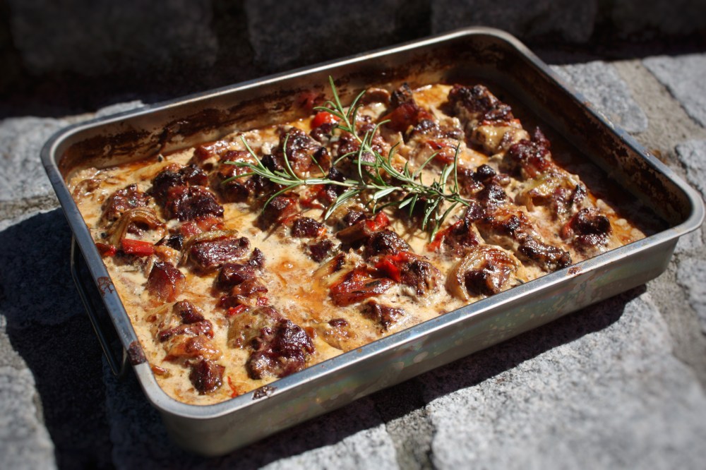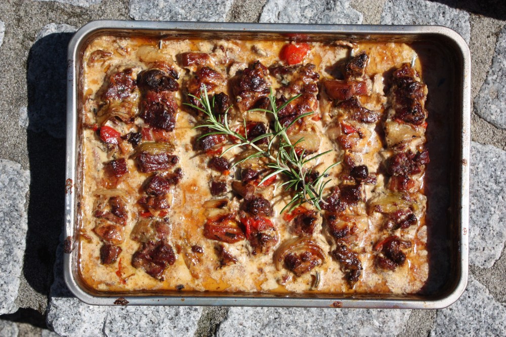 Sind die 2 Stunden vergangen, wird die Sahne hinzugegeben und das Ganze eine weitere Stunde gegart. Die Spieße immer wieder mal etwas drehen, damit die Stücke, die aus der Flüssigkeit schauen, nicht zu dunkel werden.