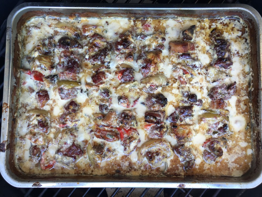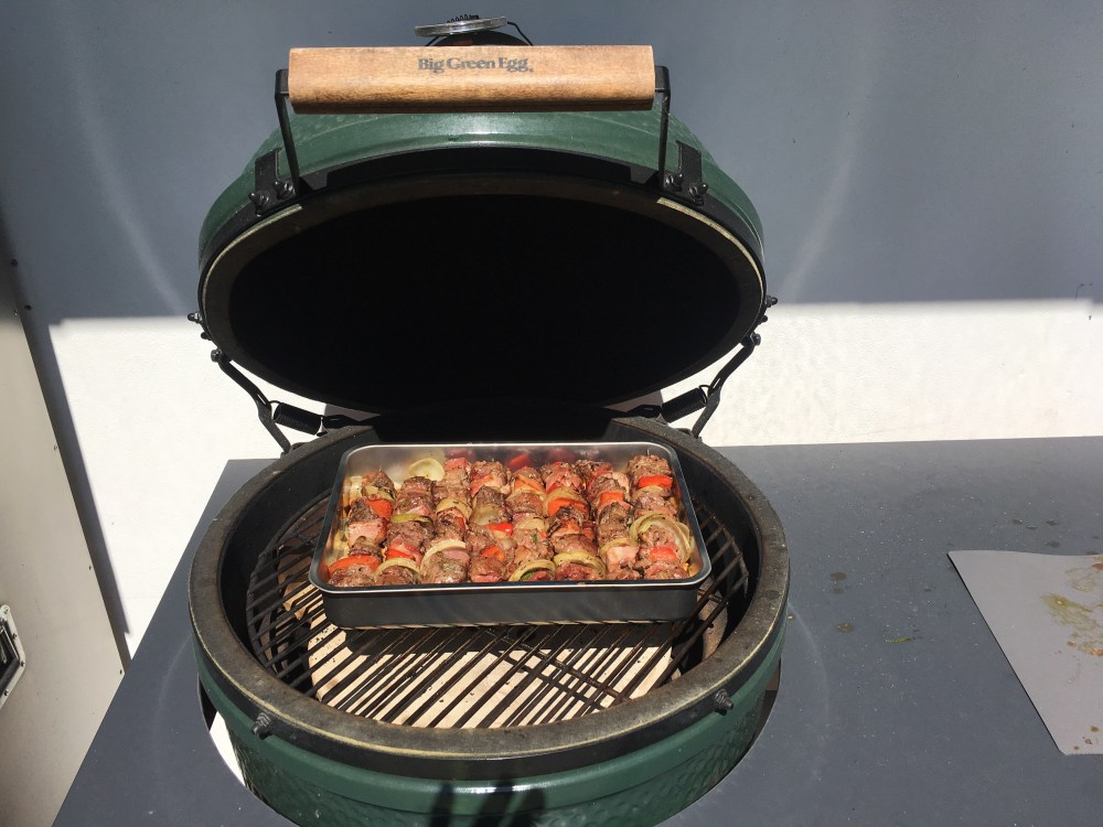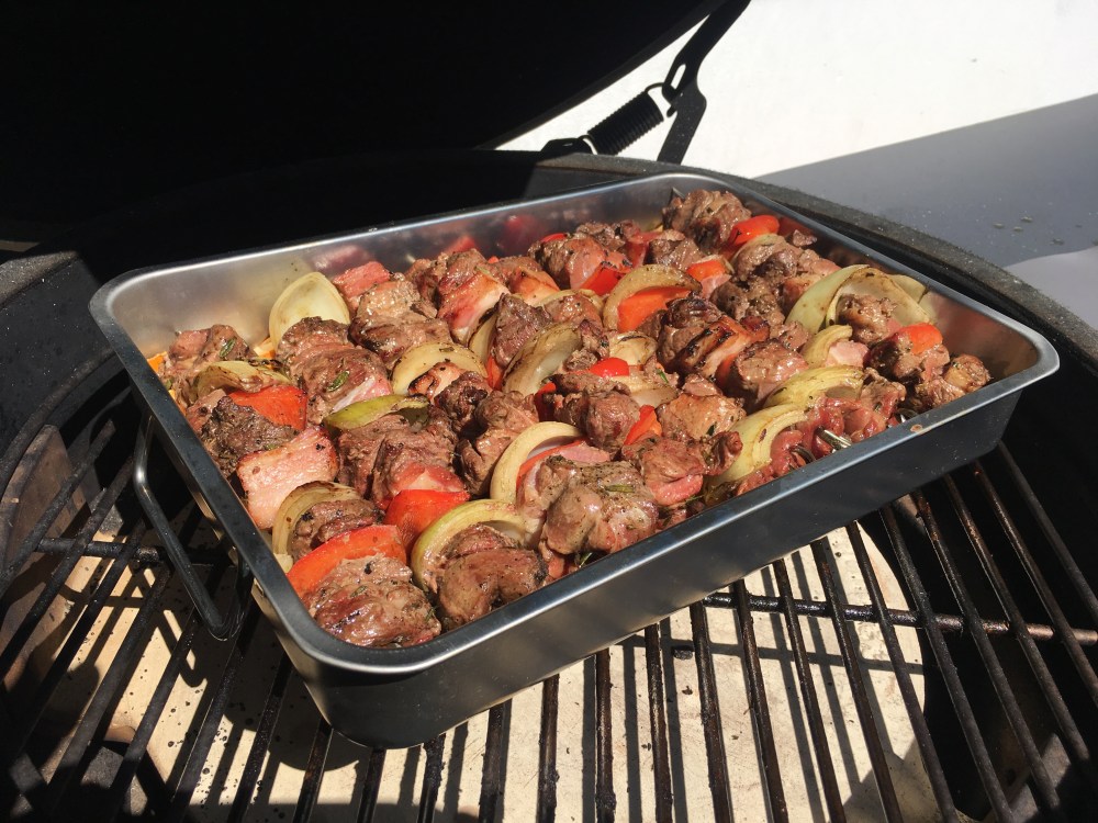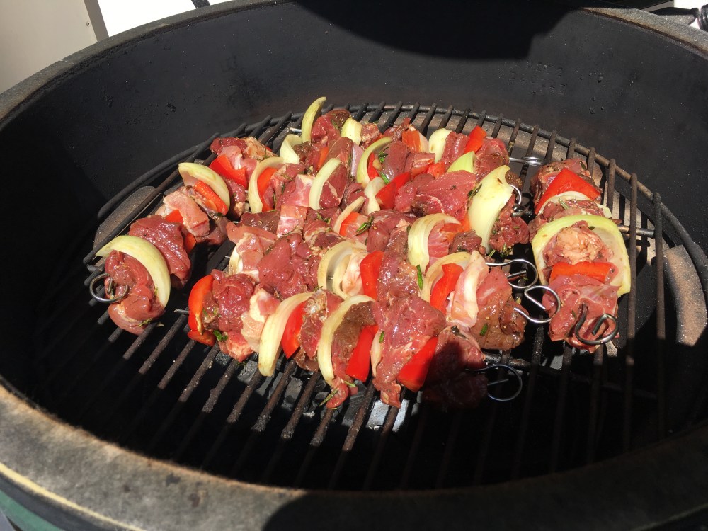 Den Grill auf direkte Hitze umrüsten. Nun die Spieße zurück in die Schale geben und mit einem halben Liter Brühe angießen und so ca. 2 Stunden bei 160 Grad schmoren lassen.