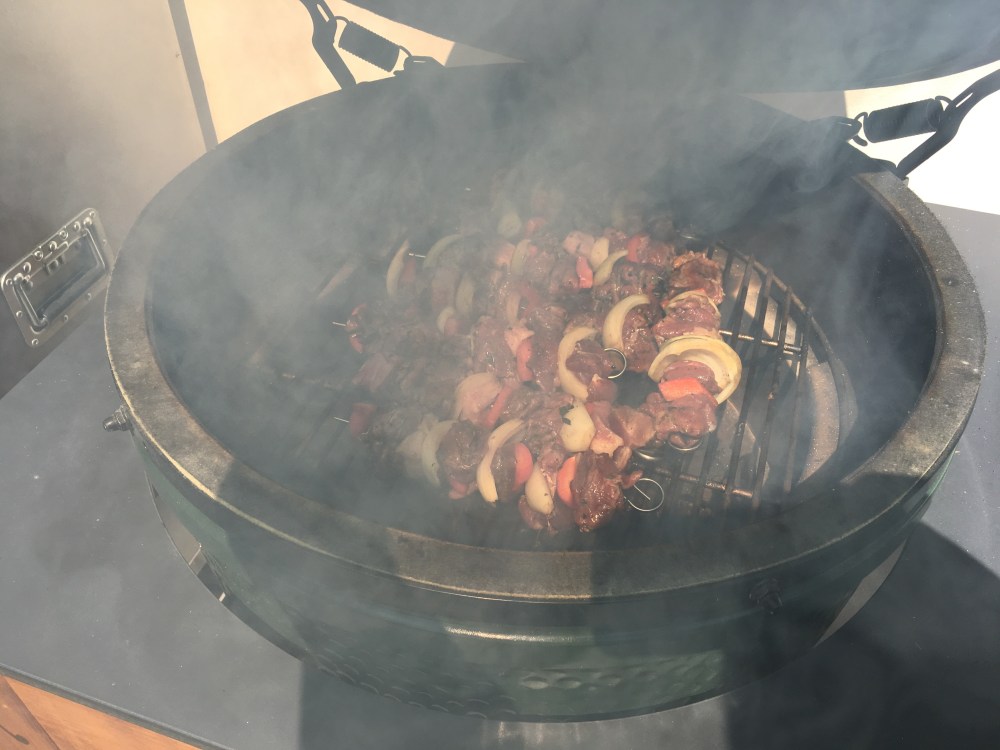 Zusätzlich kann man mit ein paar Buchenpellets oder Holzchunks, die in die Glut gelegt werden, den Spießen etwas Raucharoma verabreichen.