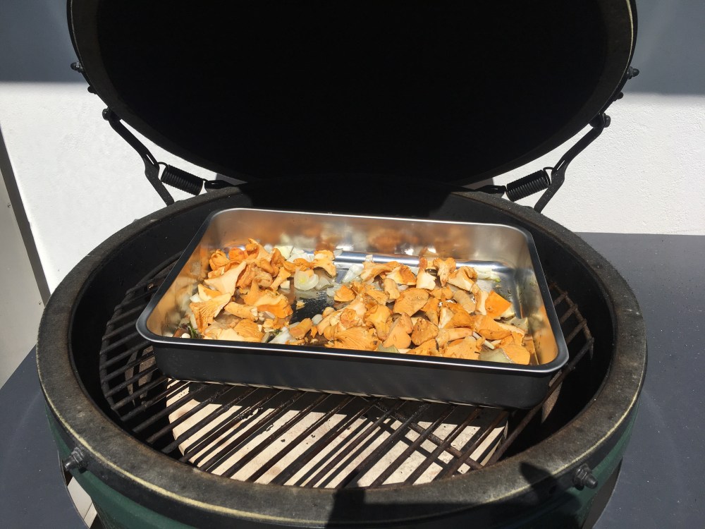 Nach ca. 15 Minuten auf dem Rost die Spieße zur Seite legen und die Pfifferlinge in einer geeigneten Schale zusammen mit den kleingeschnittenen Zwiebelresten in etwas Butter anbraten.