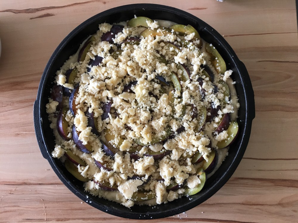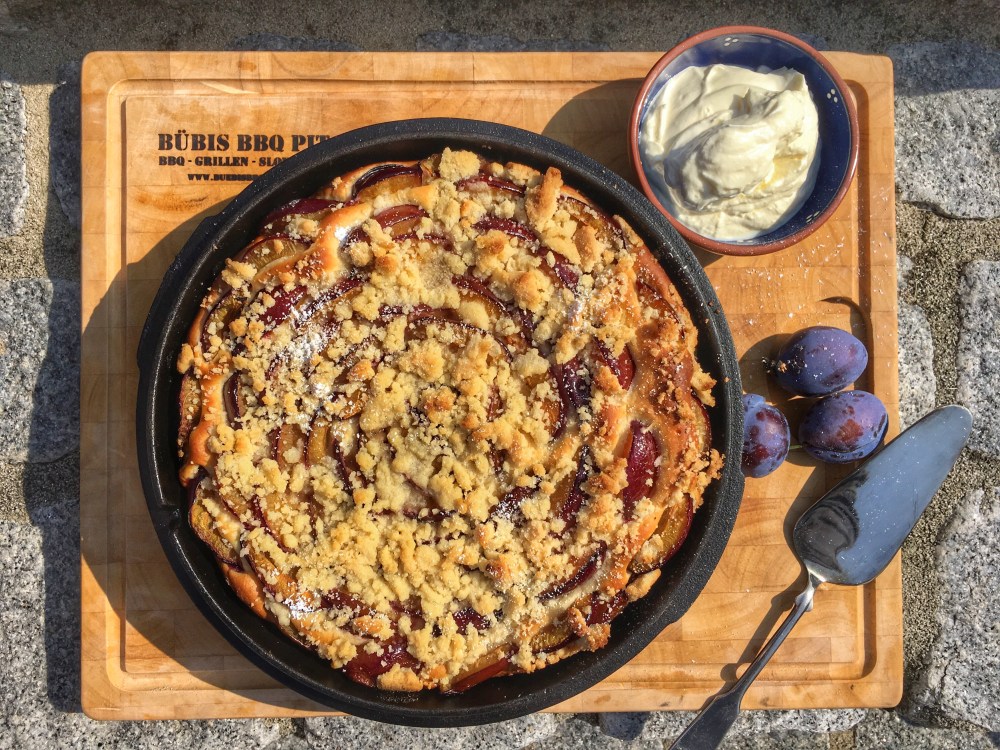 Die Pflaumen auf dem Kuchen anordnen, Streusel darüber geben und alles für ca. 35-40 Minuten im Grill backen.