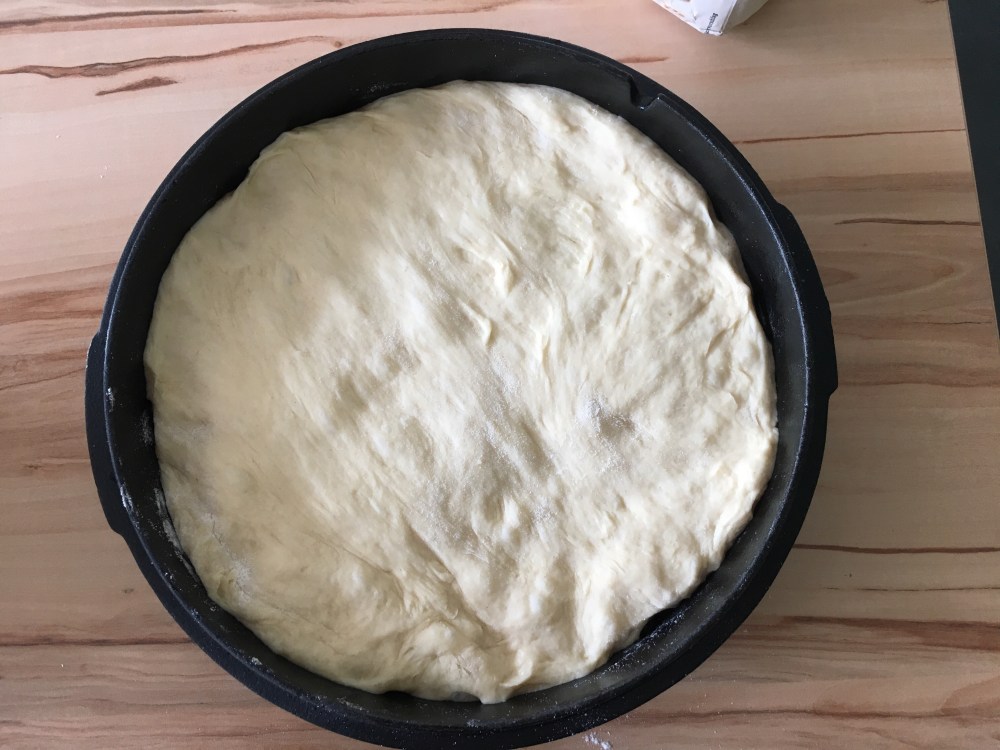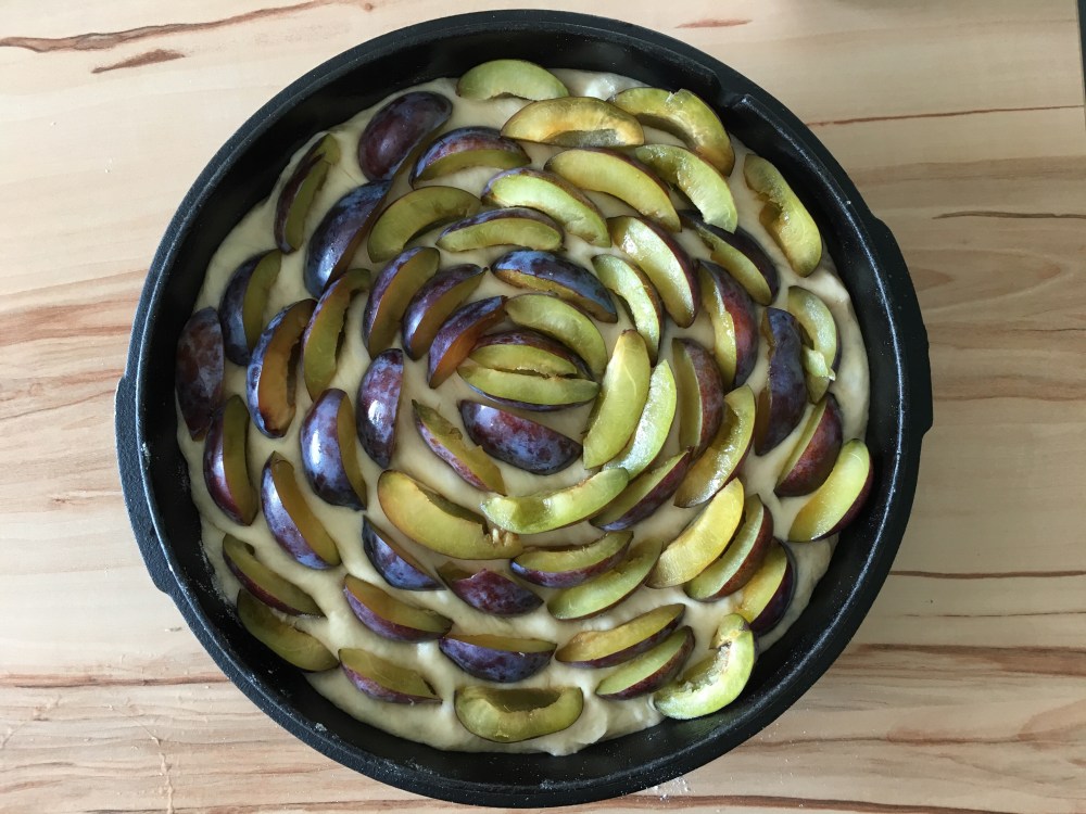 Die Pflaumen säubern und halbieren, den Stein entnehmen. Die Hälften dann noch mal halbieren oder dritteln (je nach Größe der Pflaumen). Den Dutchovendeckel mit Trennspray oder Öl einreiben und den Teig mit den Händen gleichmäßig im Deckel ausbreiten.