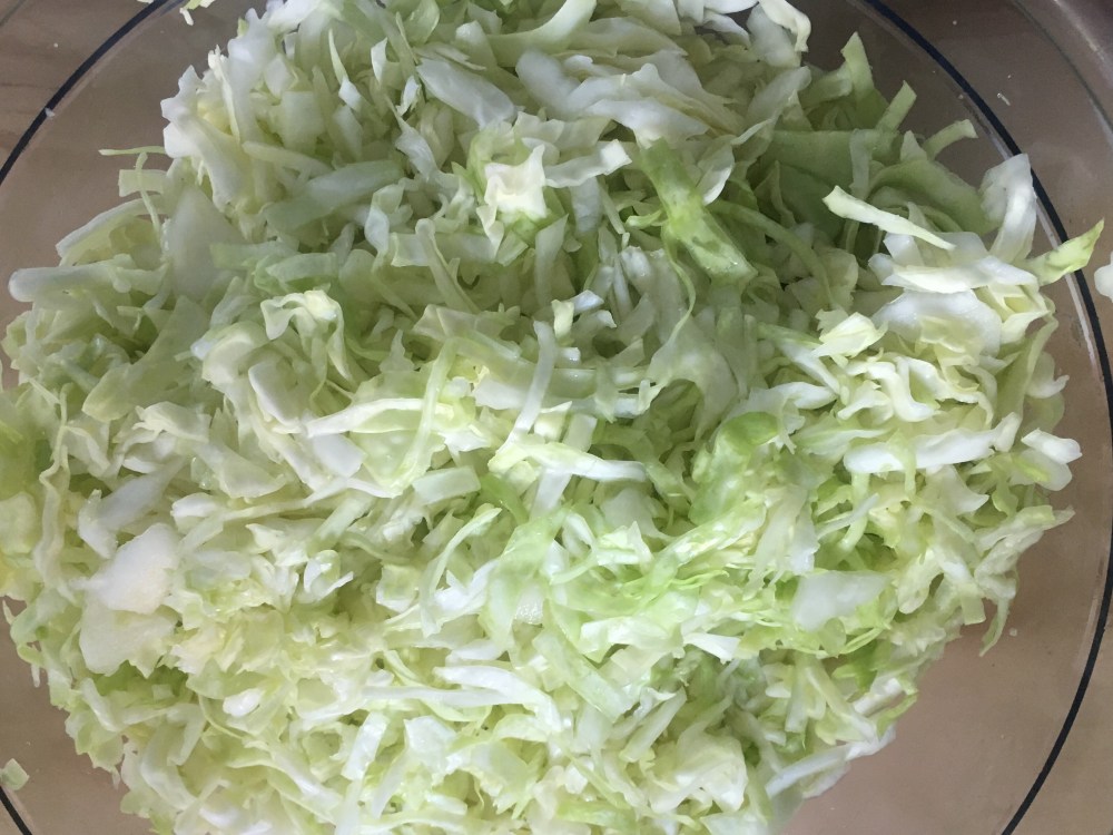 Von der Spitze her den Kohl in feine Streifen schneiden in eine Schüssel geben und mit dem Salz vermengen. Kurz ziehen lassen und dann mit den Händen gut durchkneten, um die Struktur des Kohls zu brechen.